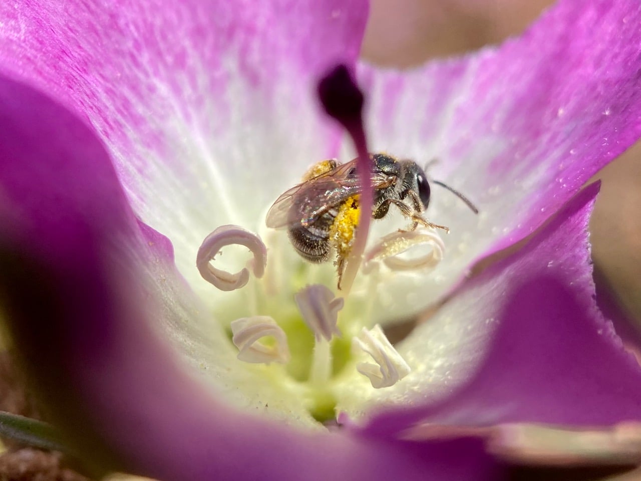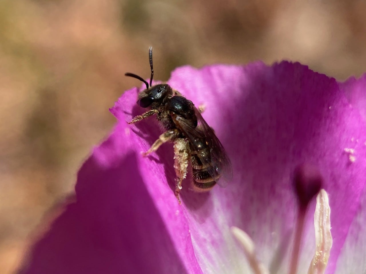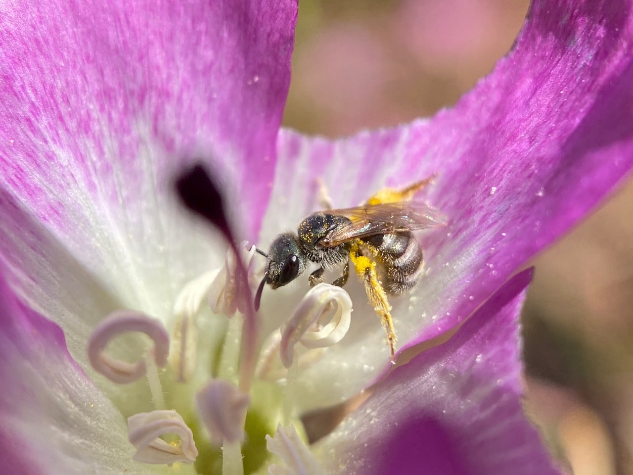 Her scopae studded with large triangular-shaped pollen grains, a female Sweat Bee, Halictus sp. (family Halictidae) crawls out from a flower of Pismo Clarkia, Clarkia speciosa ssp. immacolata (family Onagraceae).