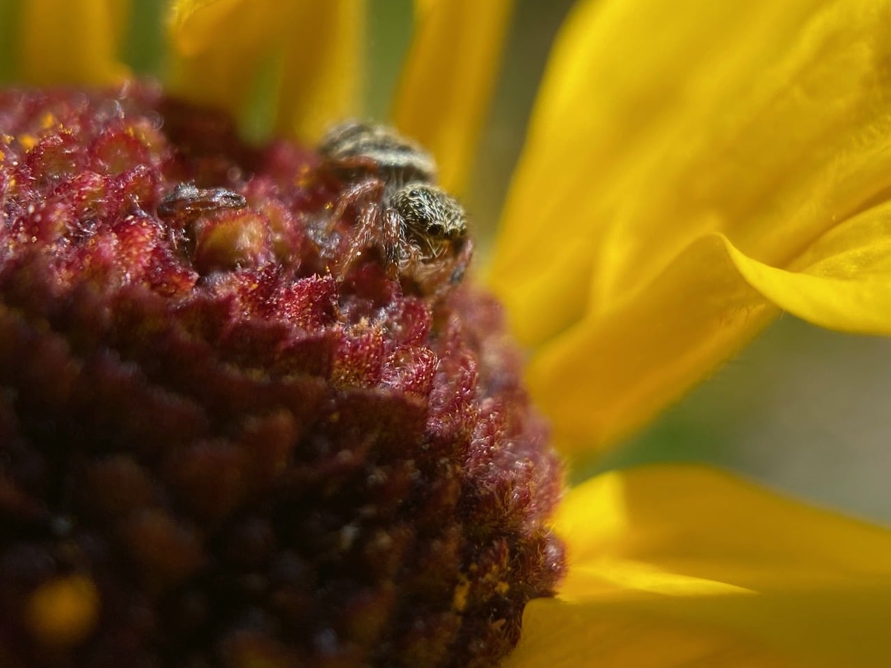 On a fresh flowerhead of California Brittlebush, a tiny Jumping Spider (family Salticidae) is hunting in a field of dark flower buds.
