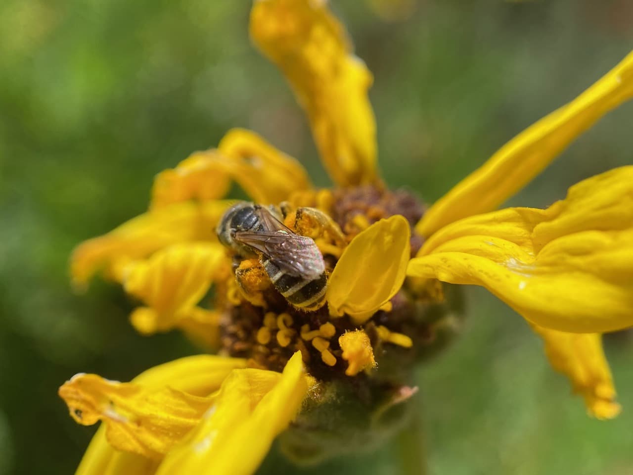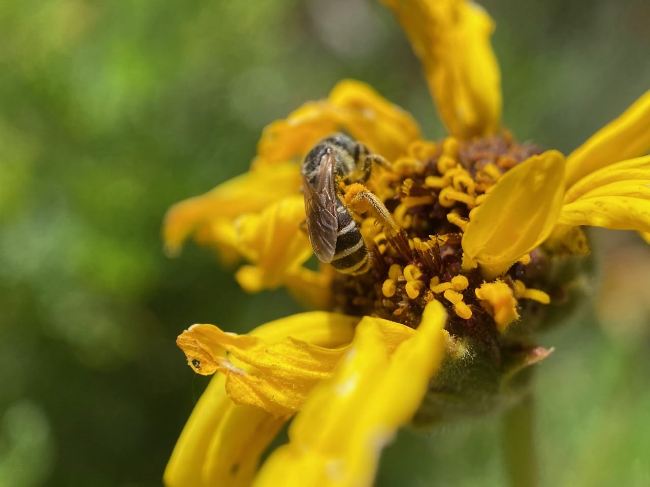 Nevertheless, the Sweat Bee is still able to gather prodigious amounts of pollen in her scopae.