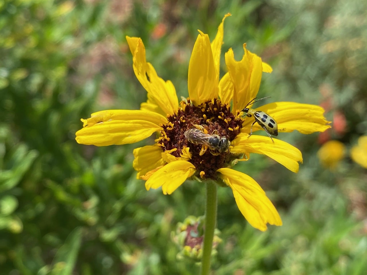 A Sweat Bee, Halictus sp. (family Halictidae) and a Spotted Cucumber Beetle, Diabrotica undecimpunctata (family Chrysomelidae) are sharing a flowerhead of California Brittlebush.
