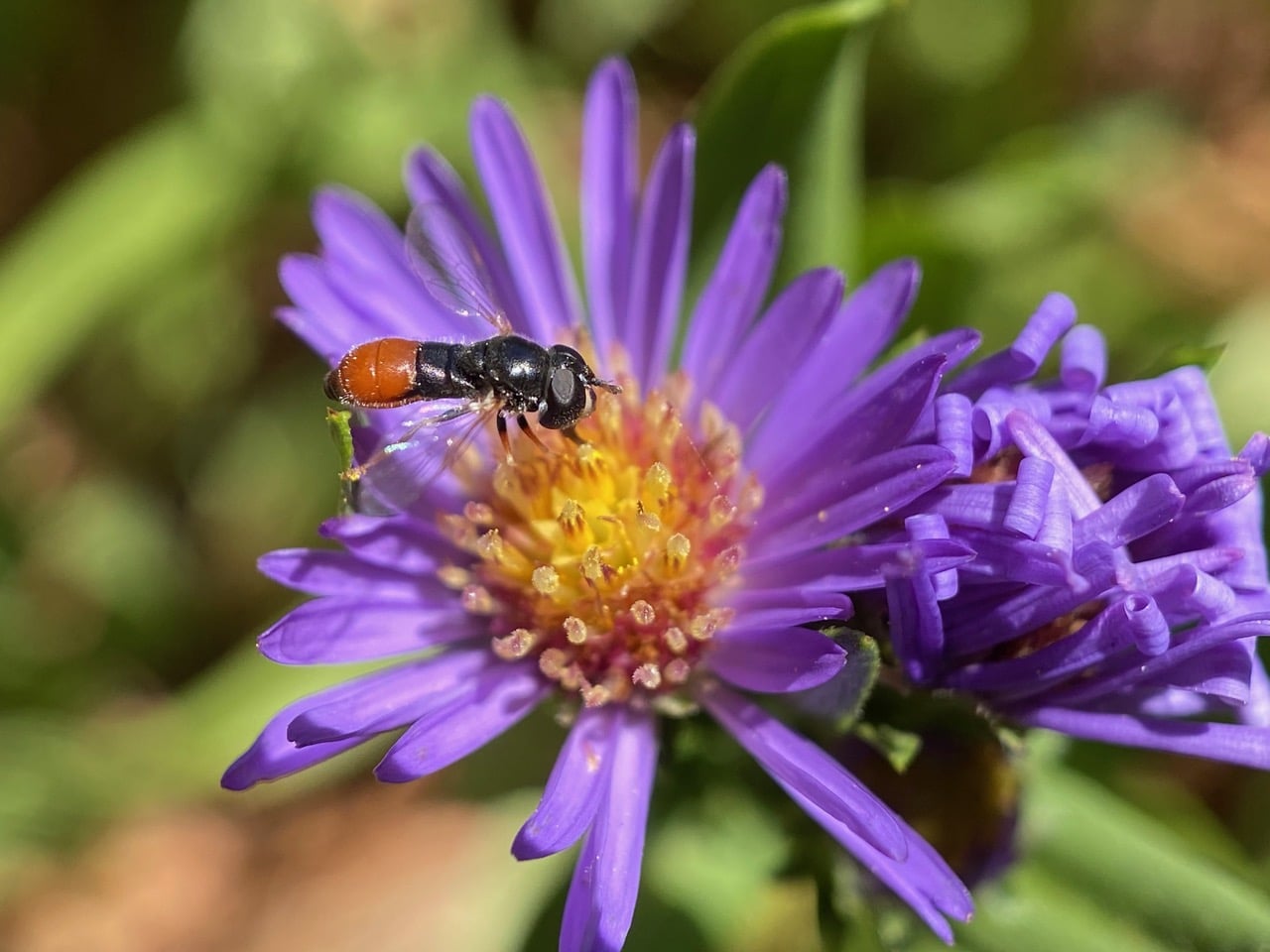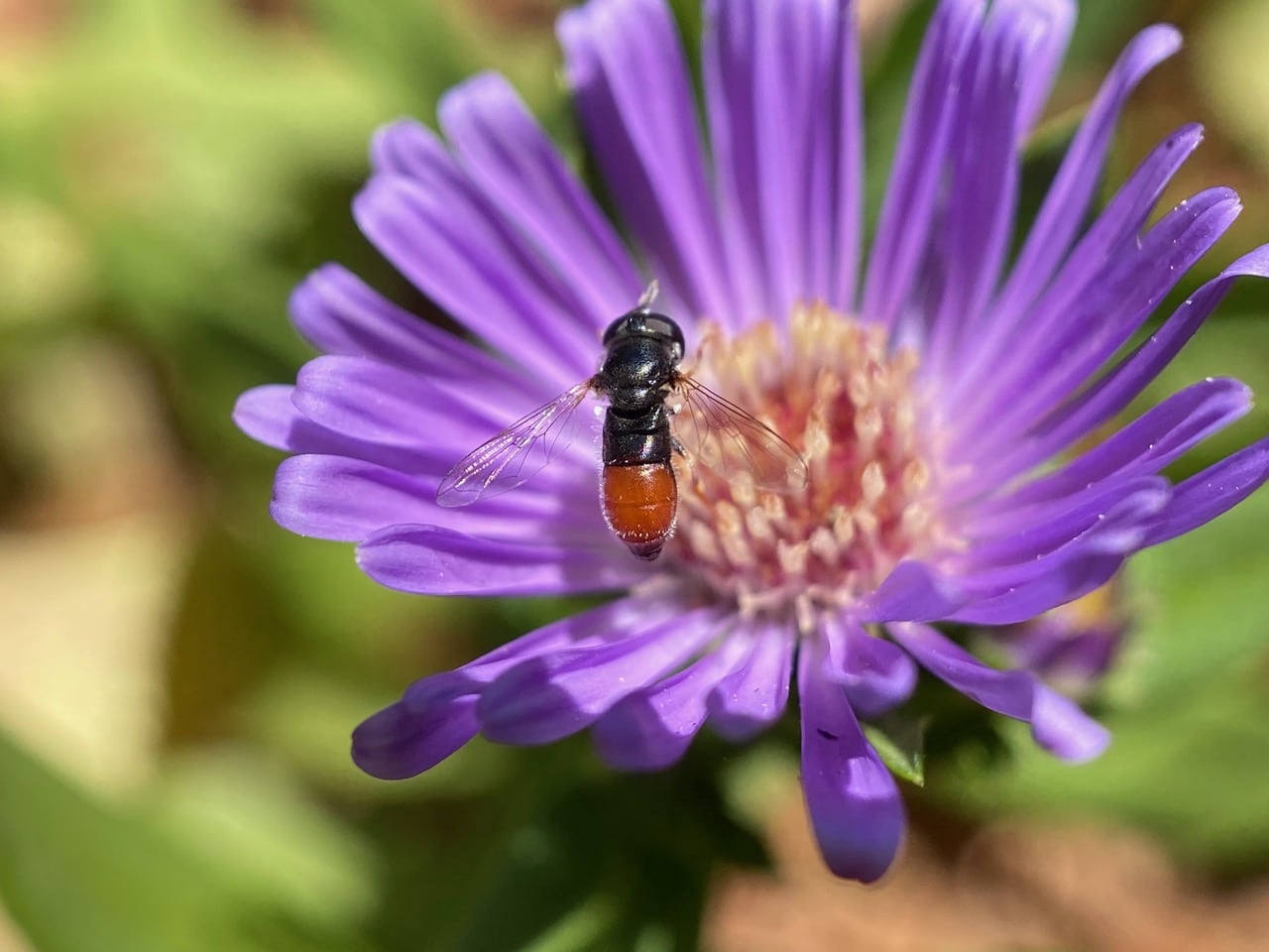 A tiny hoverfly, the Common Grass Skimmer, Paragus haemorrhous (family Syrphidae) has landed on a flowerhead of Plumas Purple Aster, Symphyotrichum x “Plumas Purple”.