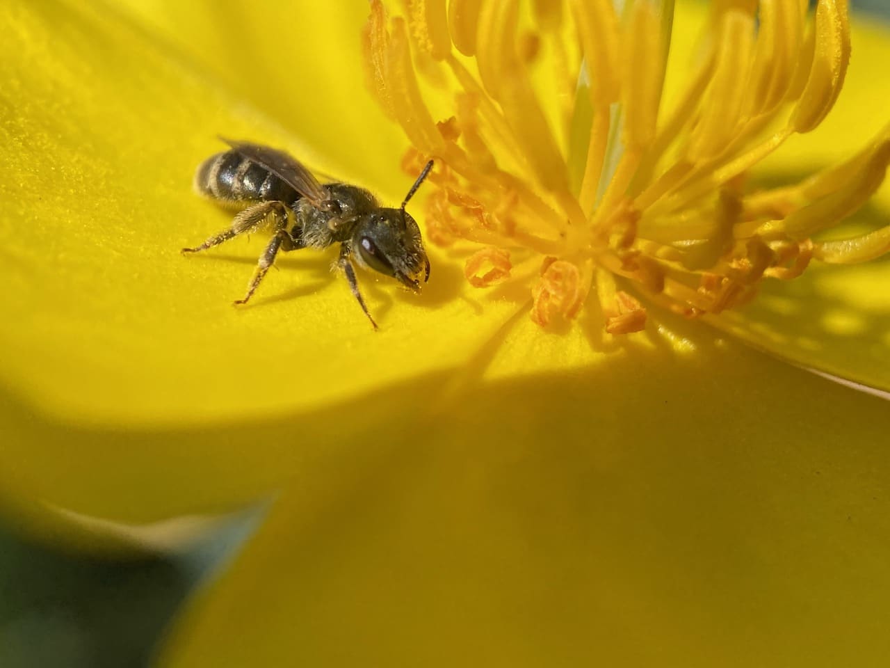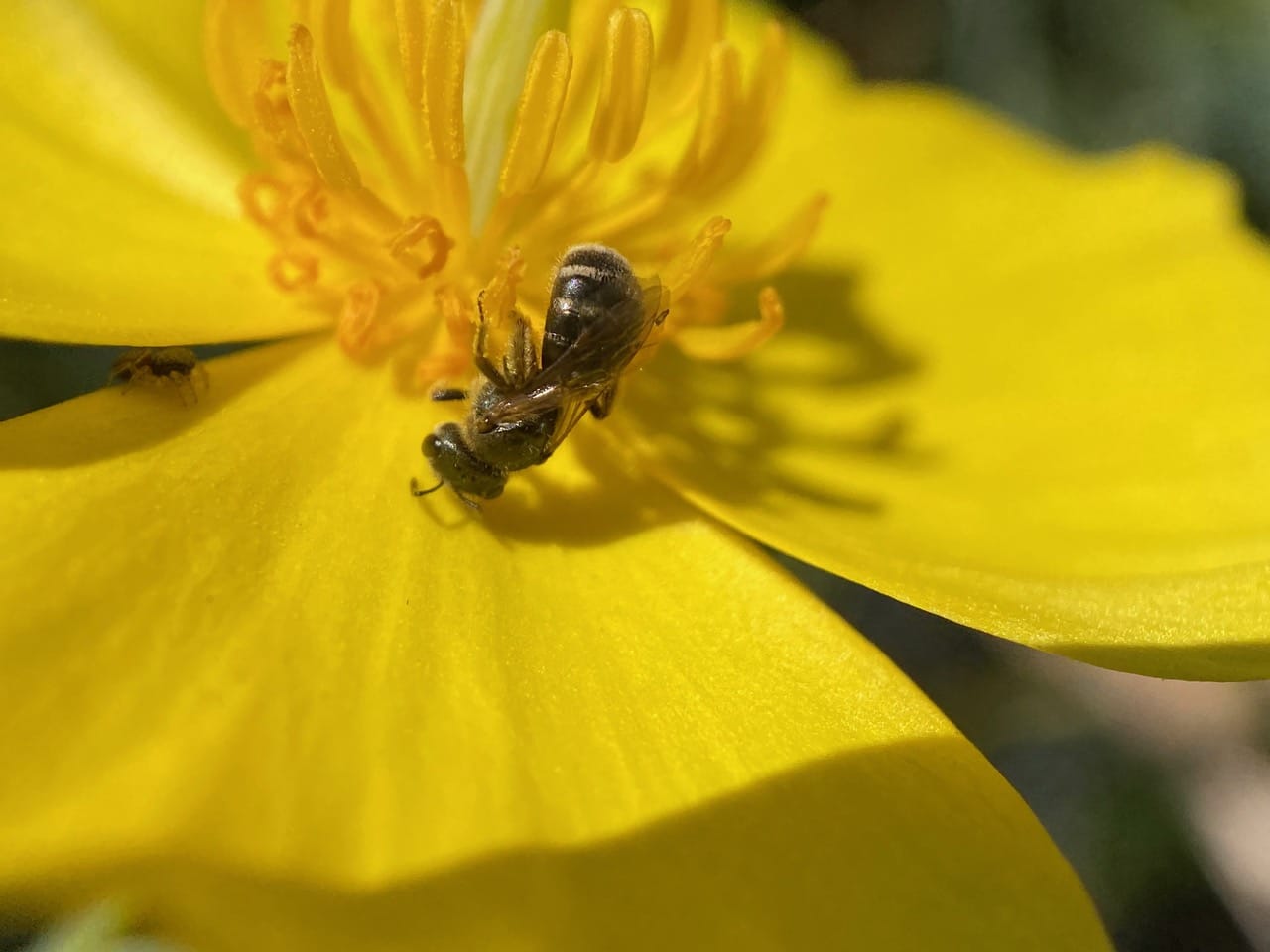 A Sweat Bee, Halictus sp. (family Halictidae) is foraging among the stamens of a Bush Poppy, Dendromecon rigida. The flowers of all species of poppy lack nectaries, thus there is no sugary nectar available to pollinators. Instead, the flowers are packed with pollen-bearing anthers