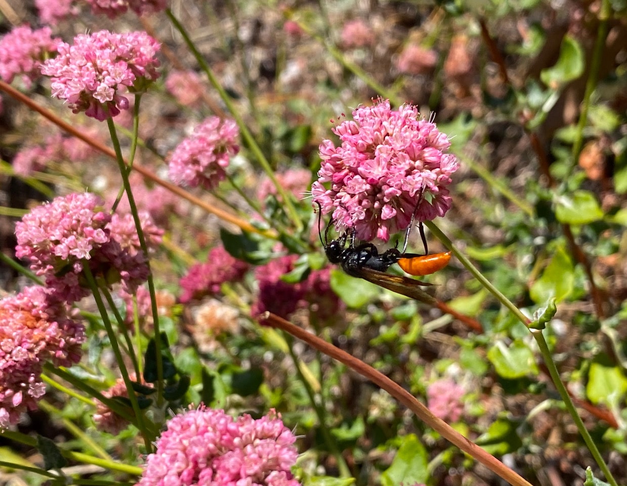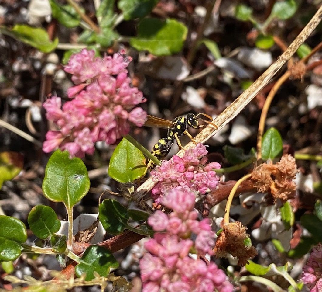 The Red-flowering Buckwheat, Eriogonum grande var. rubescens in my garden is blooming and attracting many insects including several species of wasps. See the black-and-yellow wasp on the dried flower stalk? That’s not a Yellowjacket, but a European Paper Wasp, Polistes dominula.