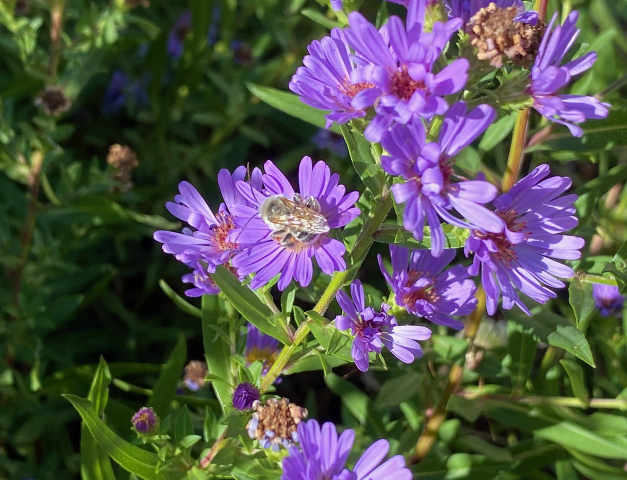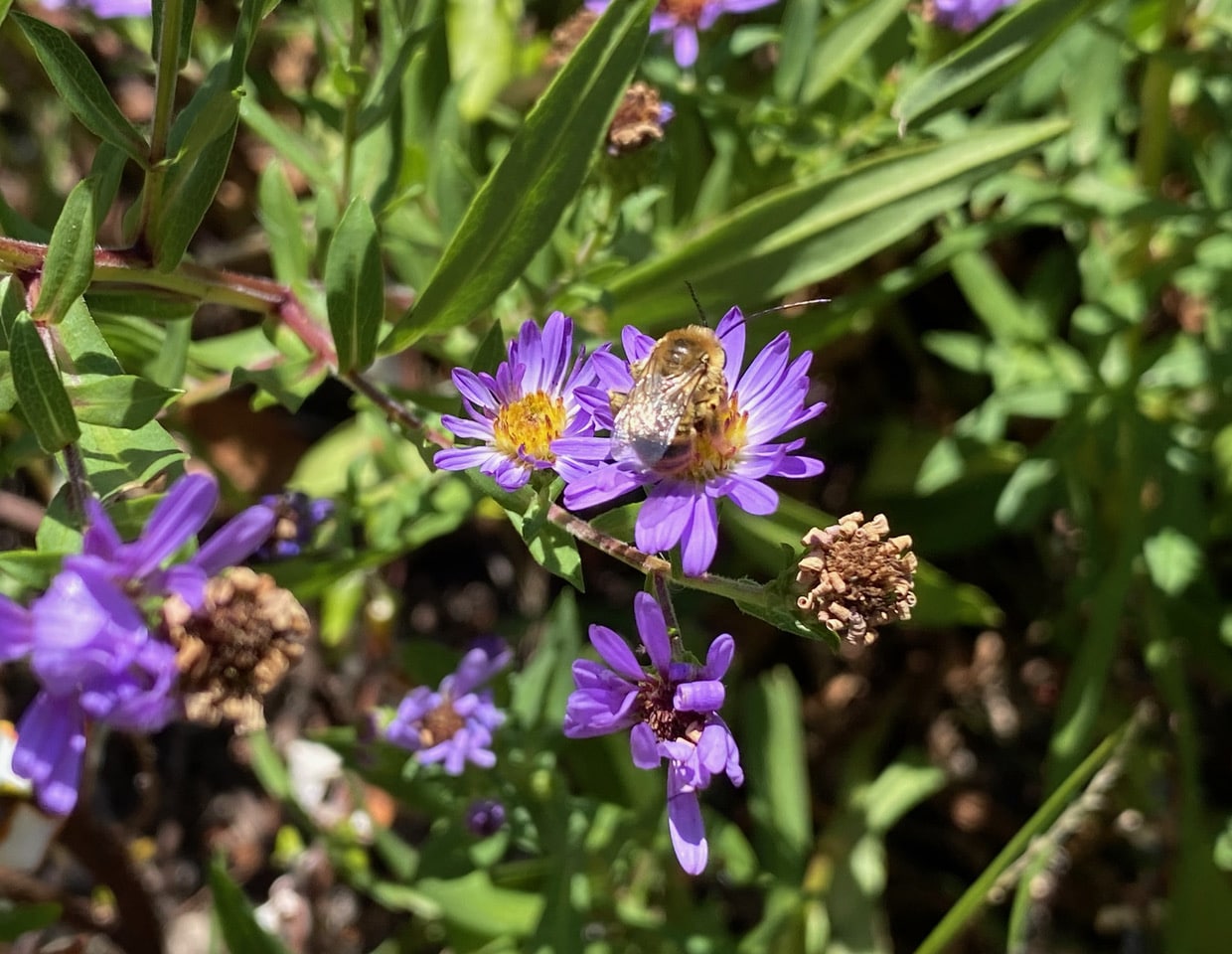 A male Summer Longhorned Bee, Melissodes sp. (family Apidae) is feeding on an Aster flowerhead. Note the long antennae that give rise to their common name. The antennae of the females are not particularly long. This individual is mostly brown.