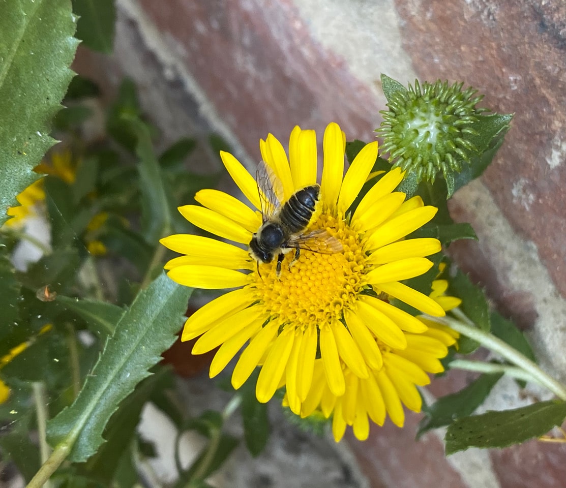 Leafcutting Bees love flowers in the sunflower family, Asteraceae because the small flowers are densely packed together in a flowerhead. All the female has to do is to walk over these flowers and tap her abdomen rapidly and lightly on the anthers to gather pollen on her belly.