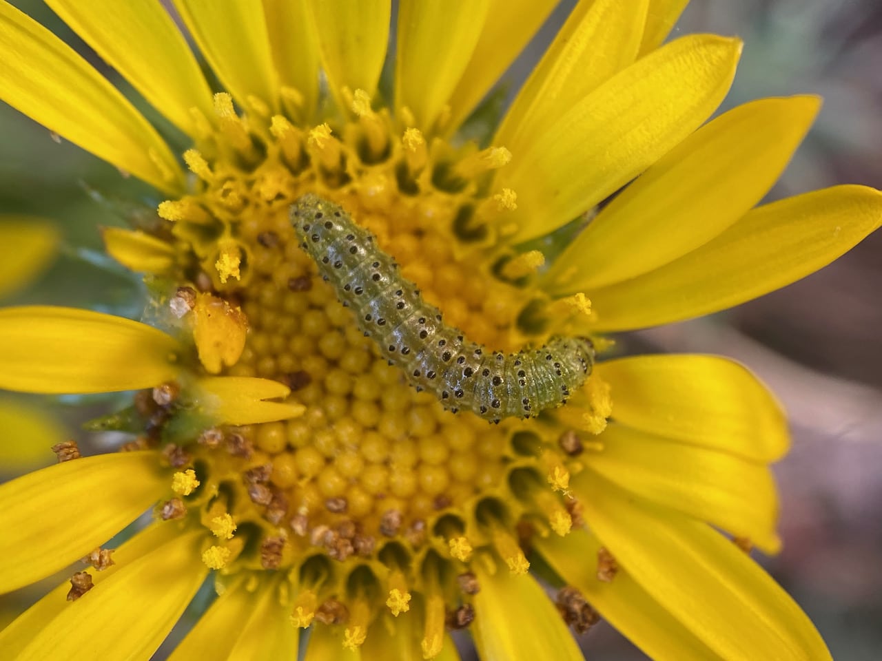 Back at my own home garden, the Gum Plant, Grindelia sp. is blooming gloriously, attracting a slew of insects. A Small Owlet Moth caterpillar, Heliothodes diminutiva (family Noctuidae) is feeding on one of the flowerheads.