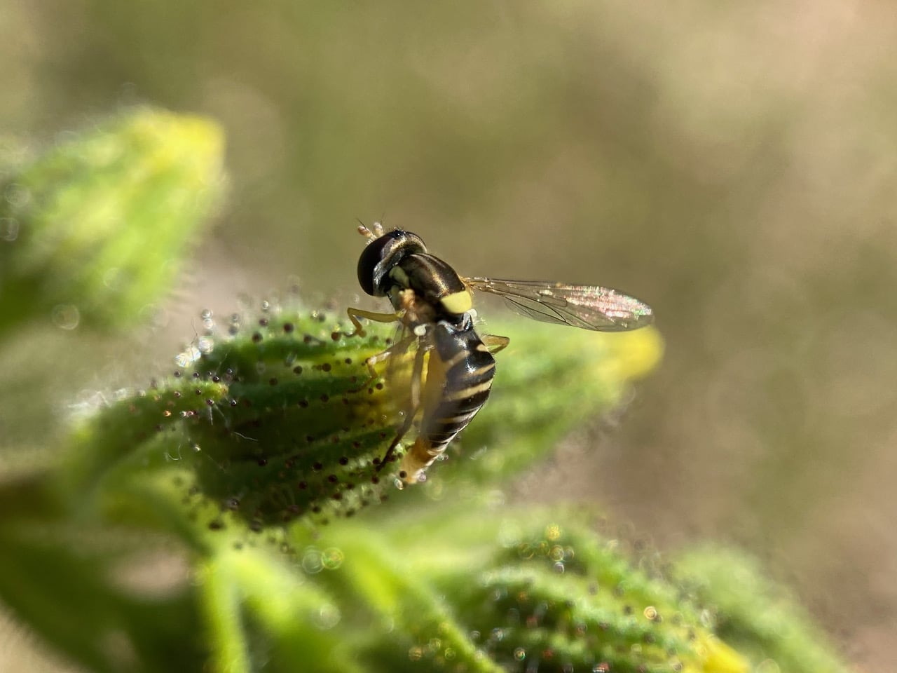 A female Forked Globetail, Sphaerophoria sulphuripes (family Syrphidae) hovers slowly around, scanning the plant. She eventually lands on an immature flowerhead and angles her abdomen forward to lay an egg. The larvae of Globetail Hover Flies are voracious predators of aphids. Females seek out plants with aphid infestation and lay their eggs among or near the aphid colony. Syrphid eggs are usually laid singly, so that the larvae won’t have to compete with each other for prey.