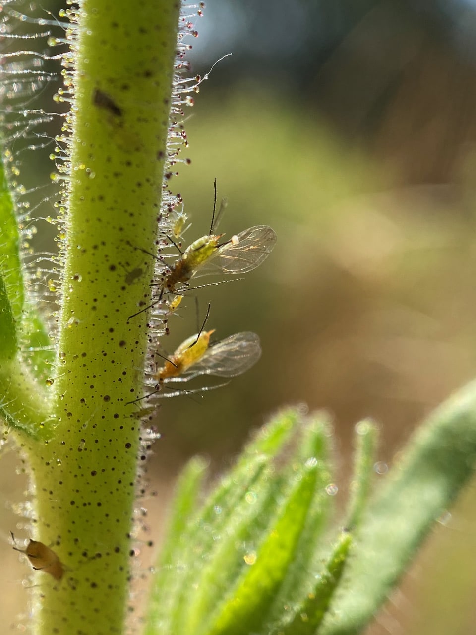 Ooh, winged aphids on the stem of Coast Tarweed! New arrivals? These look like the ones I found on the plants at Siesta Gate last year. Probably Macrosiphum sp. (family Aphididae). They seem to be immune to the sticky exudates of the plant.