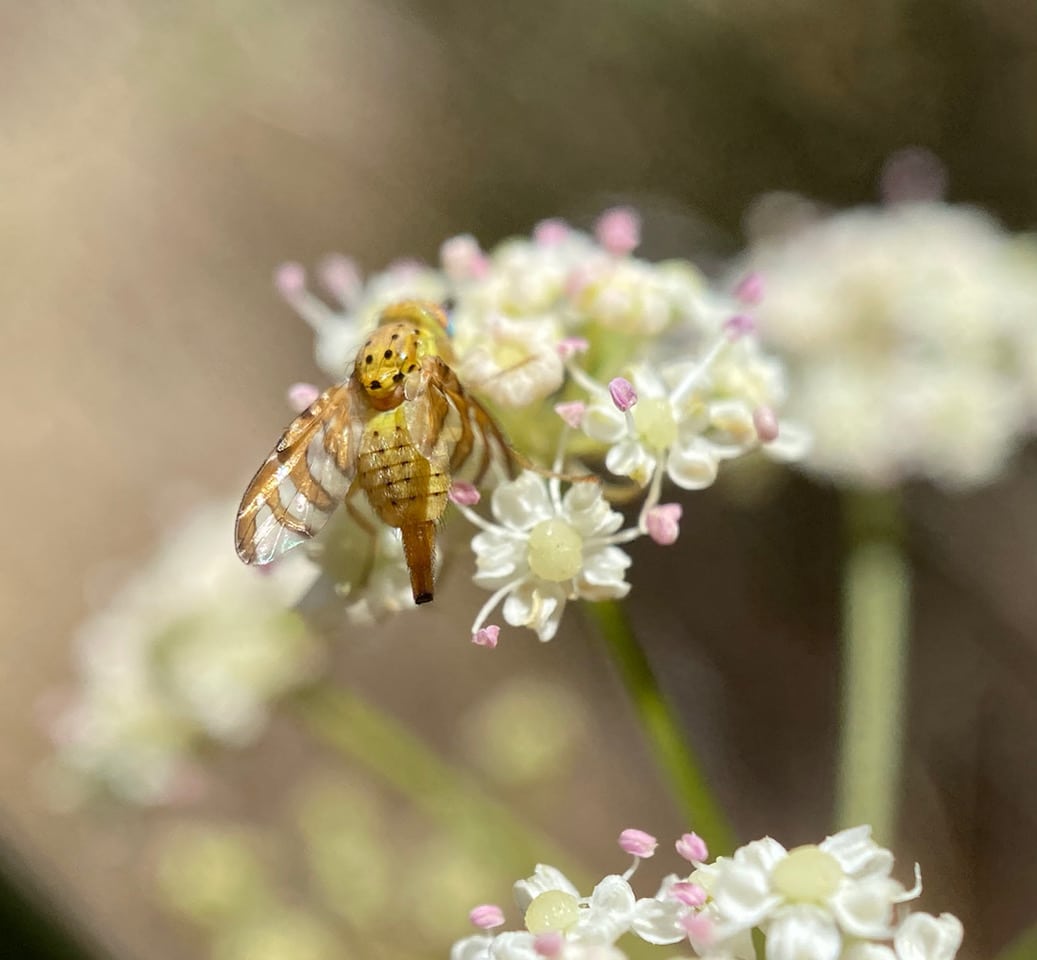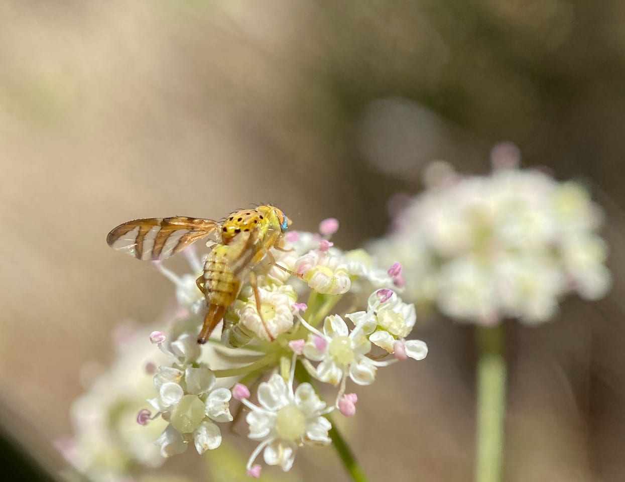 Hey, there’s a small, pale insect with beautiful picture wings on the Yampah flowers! It is a Fruit Fly, Chaetorellia sp.(family Tephritidae). From the oviscape on the tip of its abdomen, we can tell that it is a female. The oviscape is the basal part of the ovipositor of some insects, typically the non-retractile sclerotized sheath that remains exposed when the telescopic ovipositor is withdrawn and not in action.