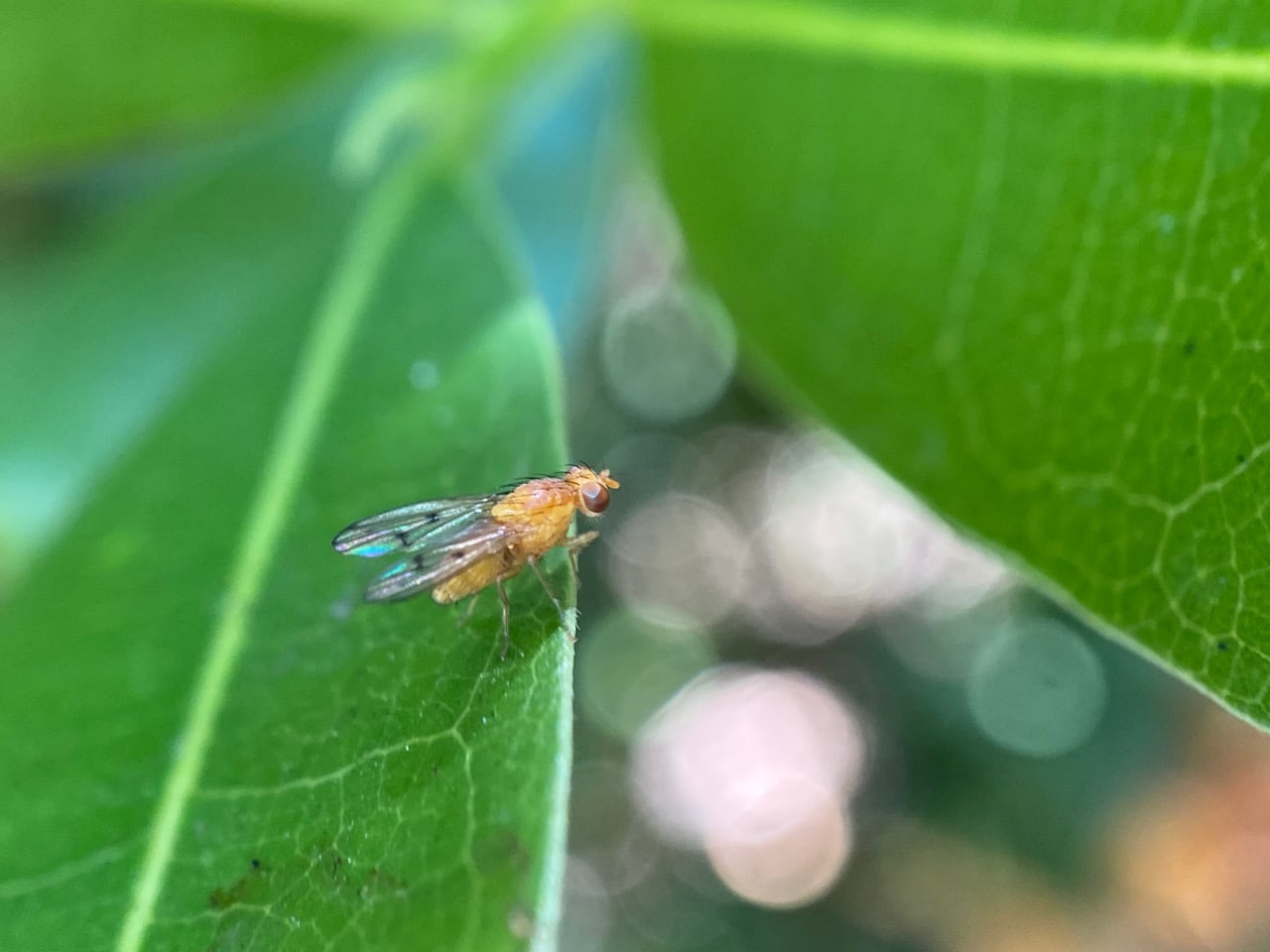 A small pale-colored fly, Homoneura sp. (family Lauxaniidae) is moving around on a Bay leaf, sometimes with its proboscis extended as if feeding on something invisible on the leaf surface. Honeydew?
