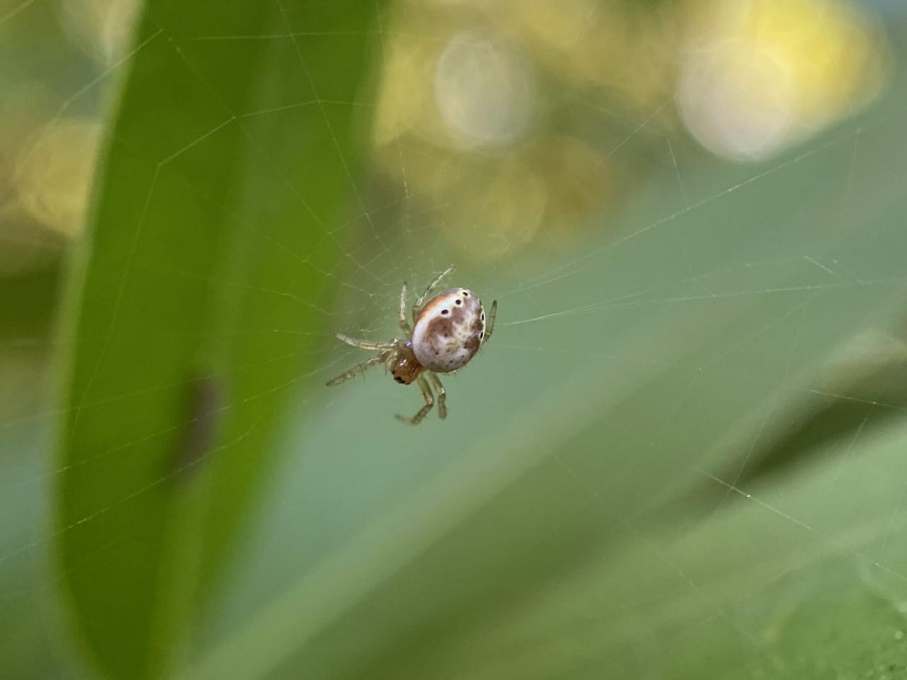 Close by, a tiny Orb-weaver Spider (family Araneidae) is sitting in the center of its circular web that it has constructed between the leaves of the Bay Tree.
