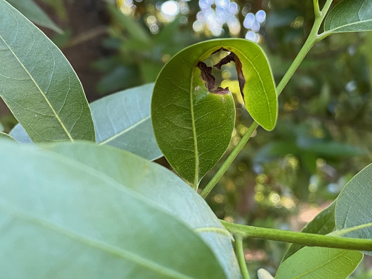 That leaf on the Bay Tree, Umbellularia californica looks like it might have been previously folded by a caterpillar that constructs those boxy, triangular shelters. Are the blackening parts where the caterpillar has been feeding? What happened to the caterpillar? Has it dropped off to pupate in the ground? Or has it been taken by a predator, such as a wasp?