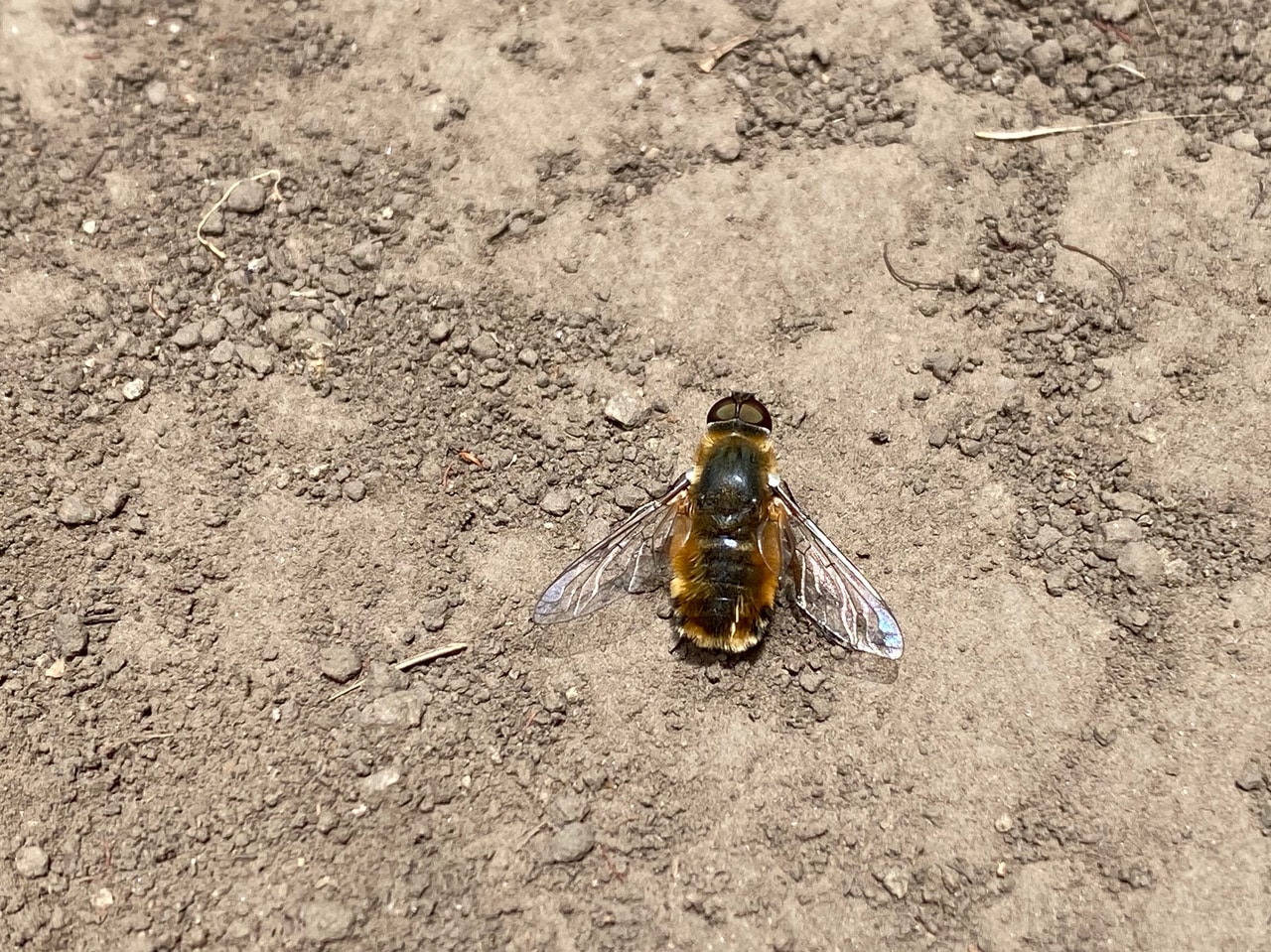 A Bee Fly, Villa sp. (family Bombyliidae) is flying low over the ground ahead of me, occasionally landing on the trail. It is difficult to get close enough to photograph these wary insects.