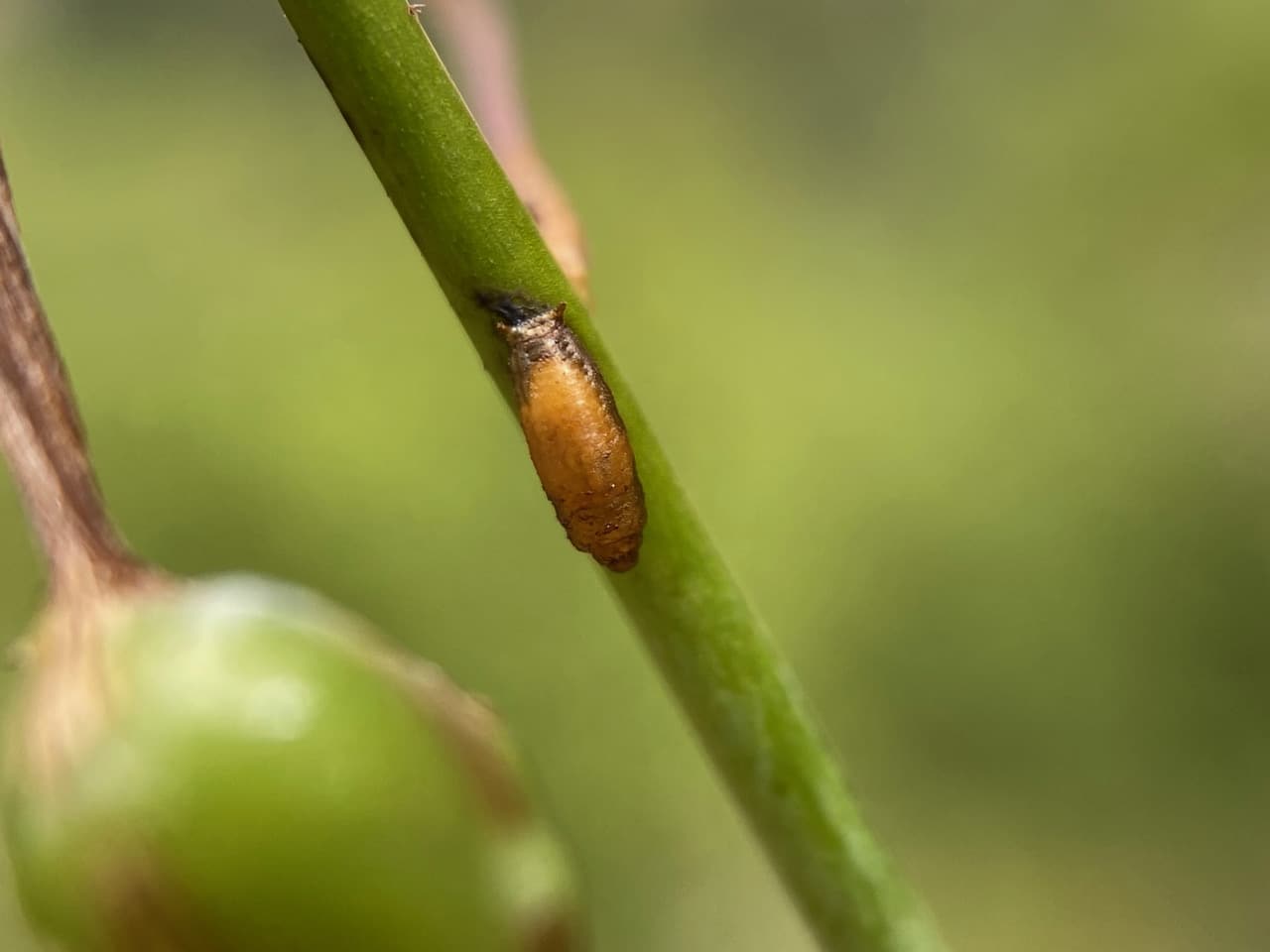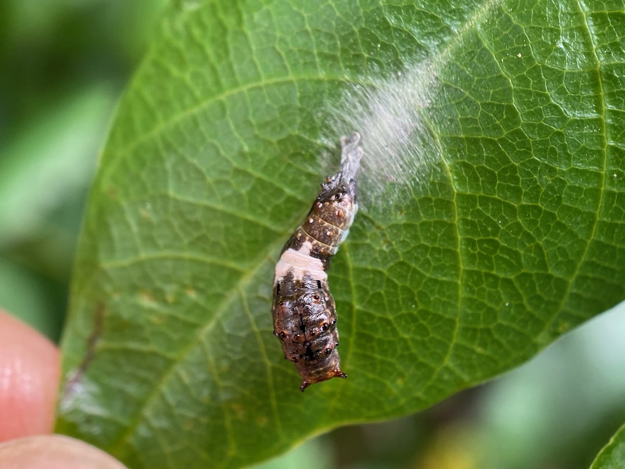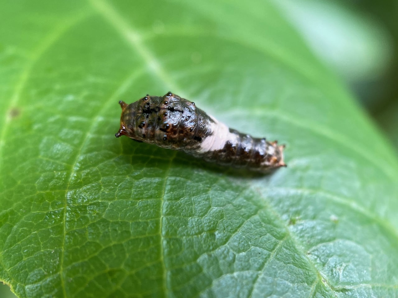30 minutes after I left the Pale Swallowtail caterpillars, I check on them again on my way back. There is no sign of the messy exuviae – the blue caterpillar has cleaned it all up!