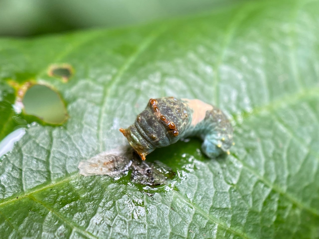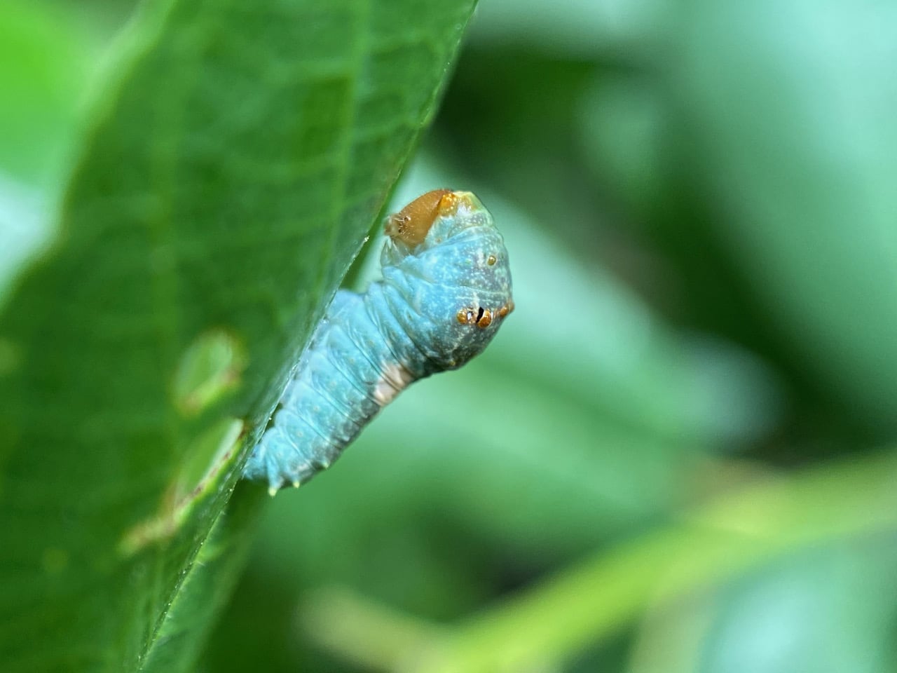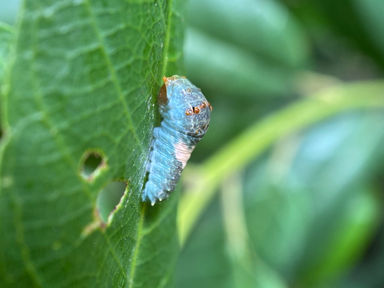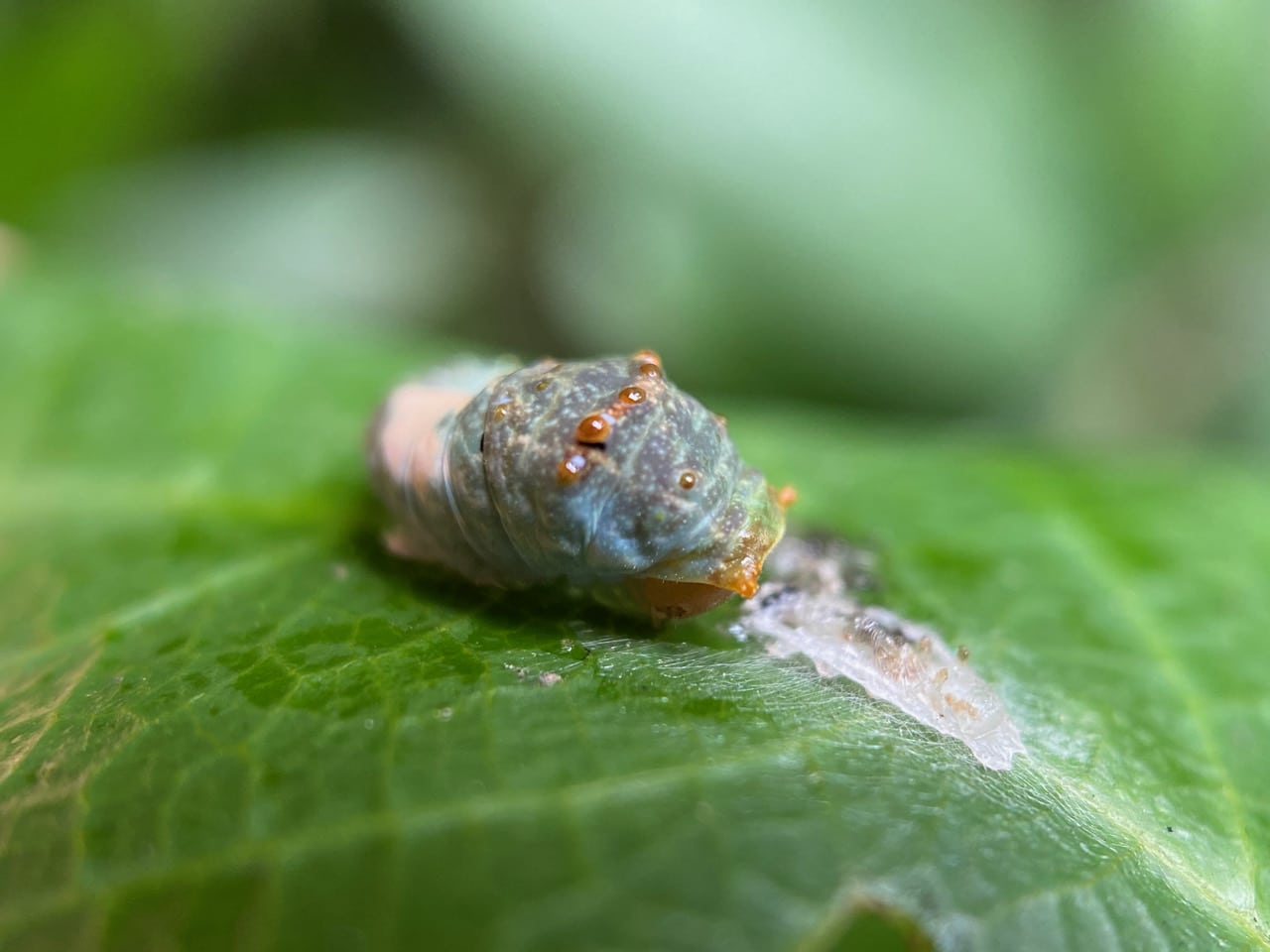 Side ways, the molted caterpillar is resplendent in blue. No longer a bird poop mimic!