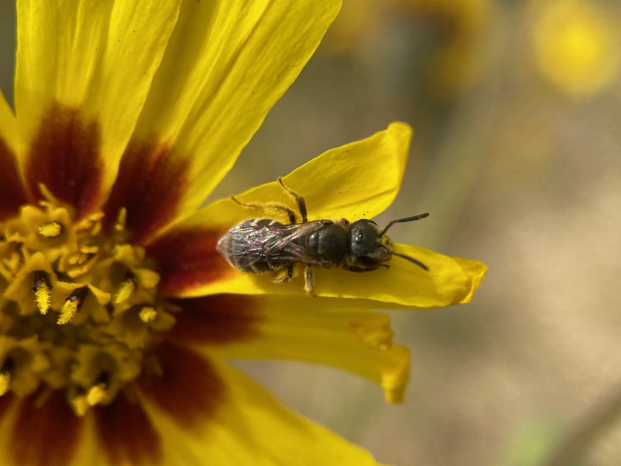 A Sweat Bee, Halictus sp. (family Halictidae) appears to be resting on a ligule of an Elegant Tarweed flowerhead. She has apparently not been collecting pollen as the scopae on her hind legs are empty.