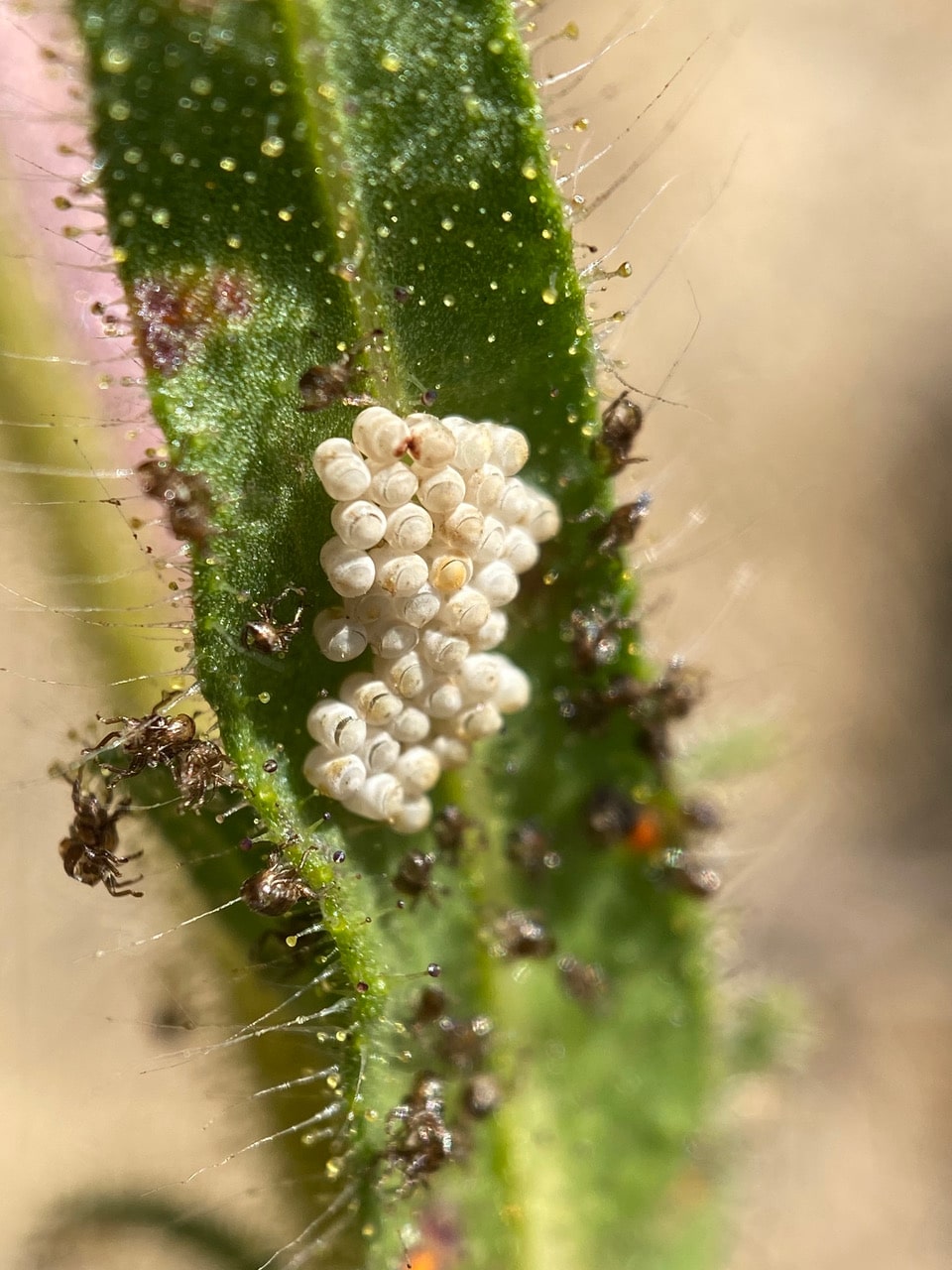 A clutch of Stink Bug eggs (family Pentatomidae) sits empty on a leaf of Coast Tarweed, Madia sativa. The nymphs have hatched synchronously from the barrel-shaped eggs through the pop tops. For the first few days, the nymphs stay together on or around the egg shells until their first molt, after which they begin to disperse. There are exuviae (shed skins) of the nymphs strewn about the eggs. The second instars have all gone their separate ways to explore the world.