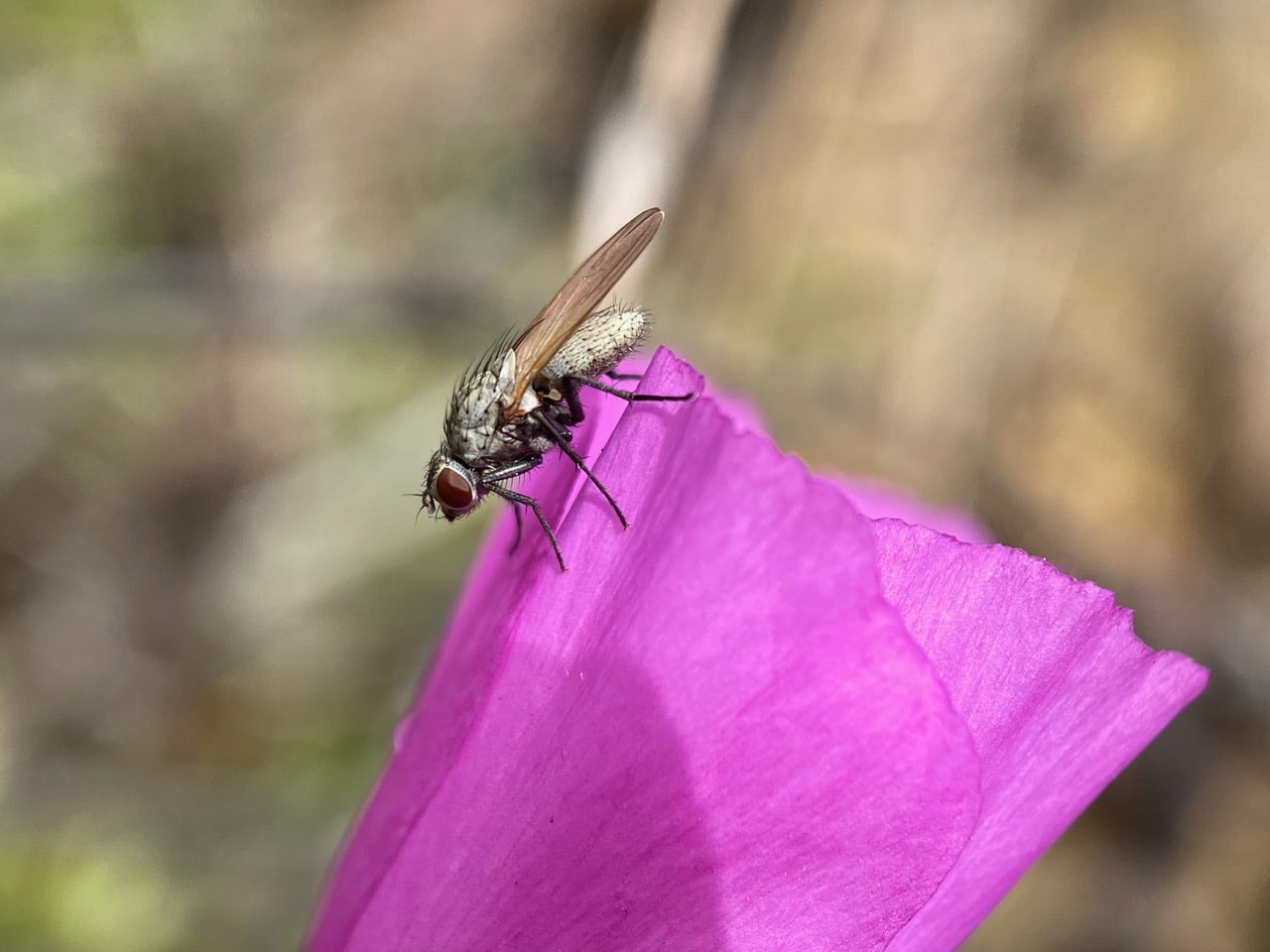 An unidentified fly is perched on a flower of Farewell-to-spring, Clarkia rubicunda.