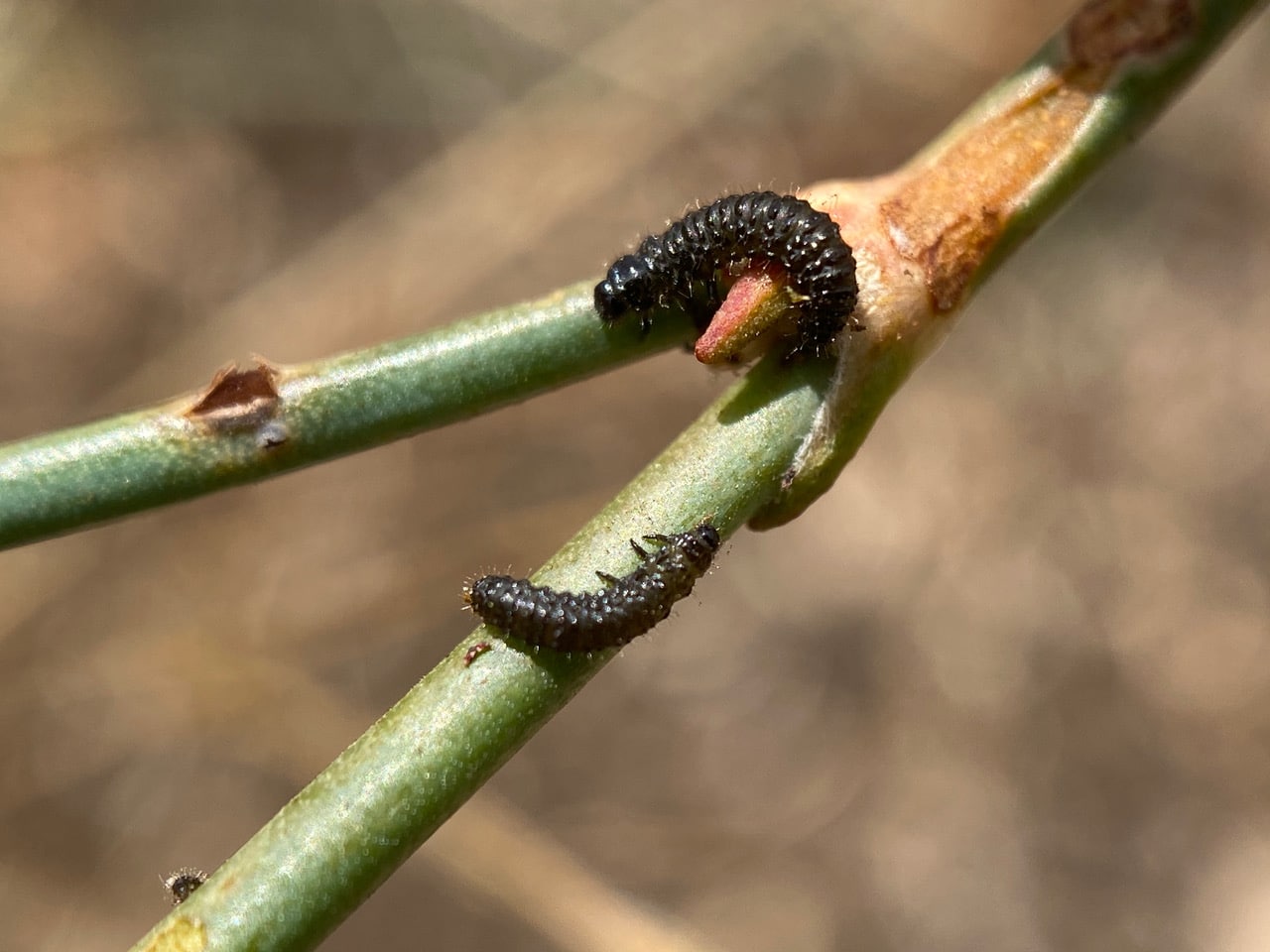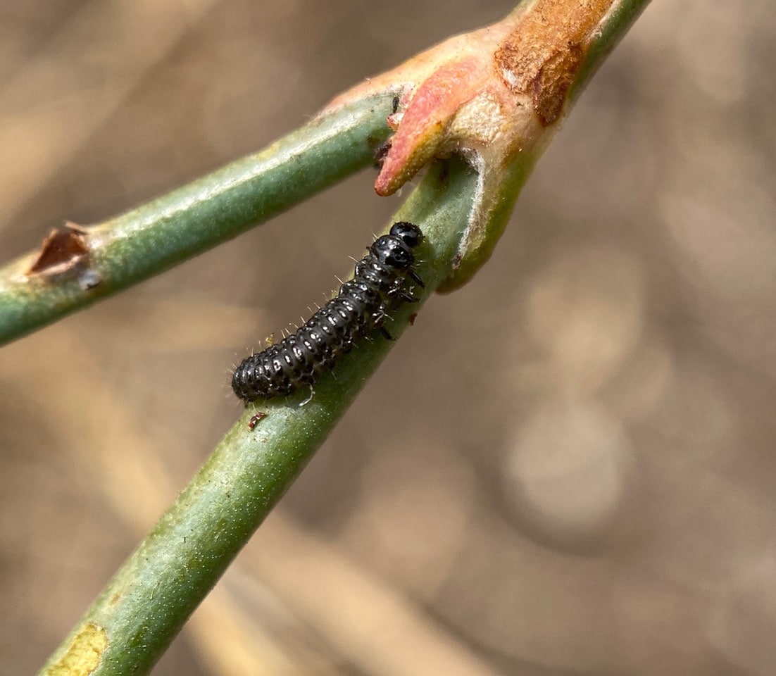 The Flea Beetle larvae are often found feeding on the stems of Nude Buckwheat.