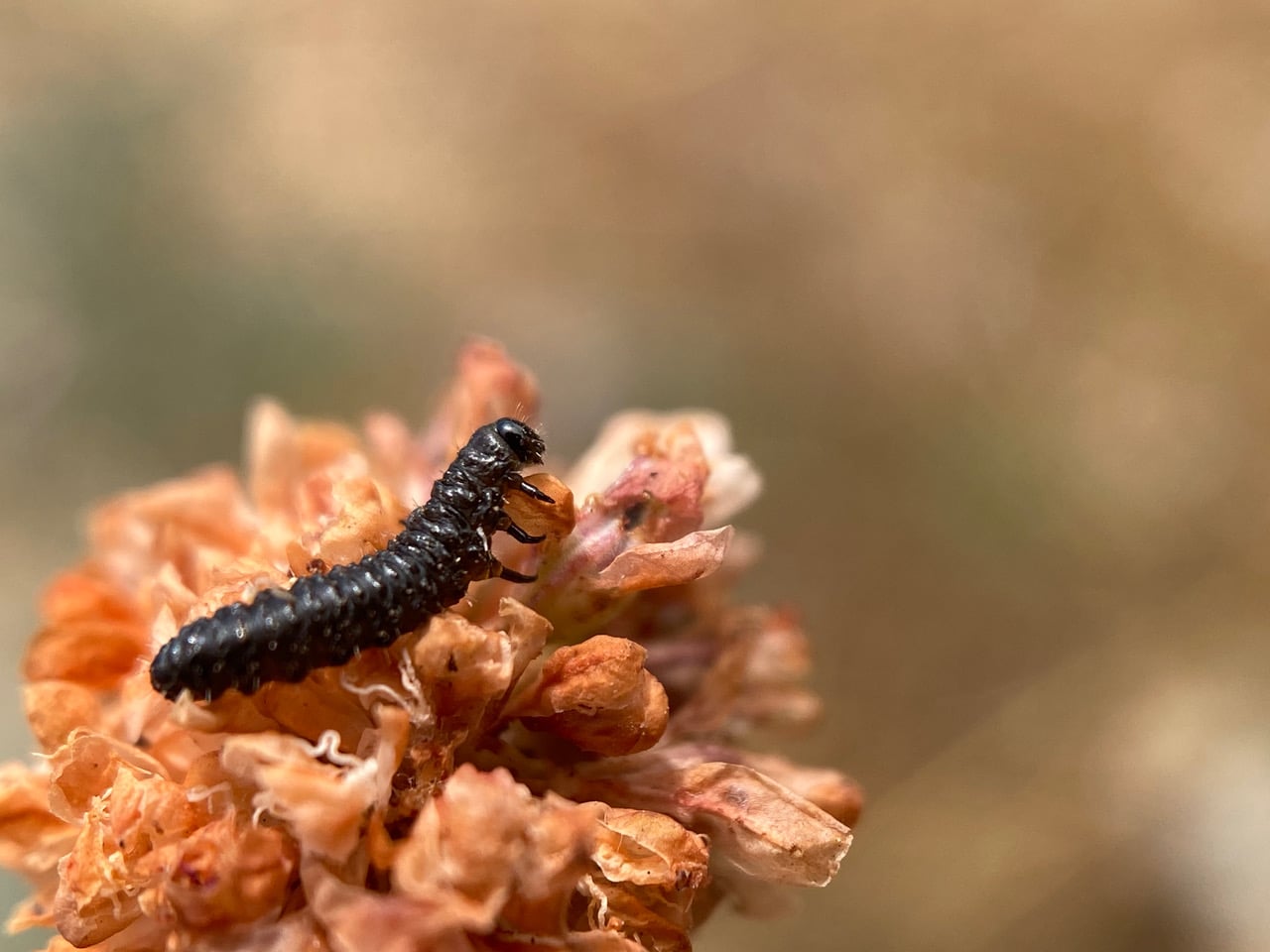 A Flea Beetle larva is moving around on a withered inflorescence of Nude Buckwheat. The shiny, black larvae resemble lepidopteran caterpillars. Like the adults, they feed on the flowers and stems of the plant.