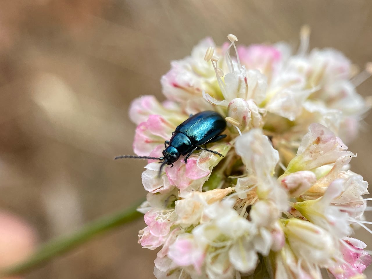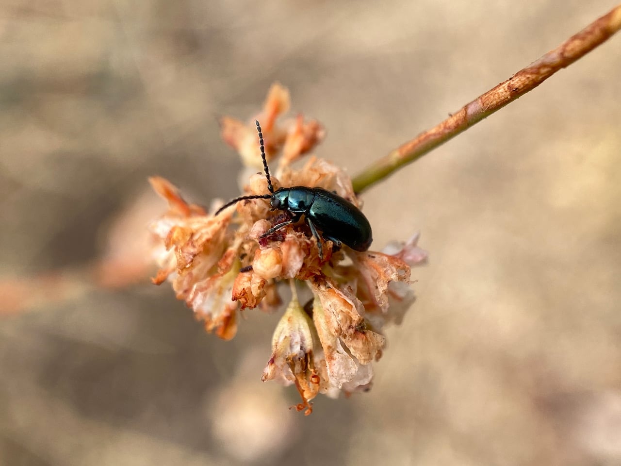 A Flea Beetle, Altica sp. (family Chrysomelidae) is resting on an inflorescence of Naked Buckwheat, Eriogonum nudum.
