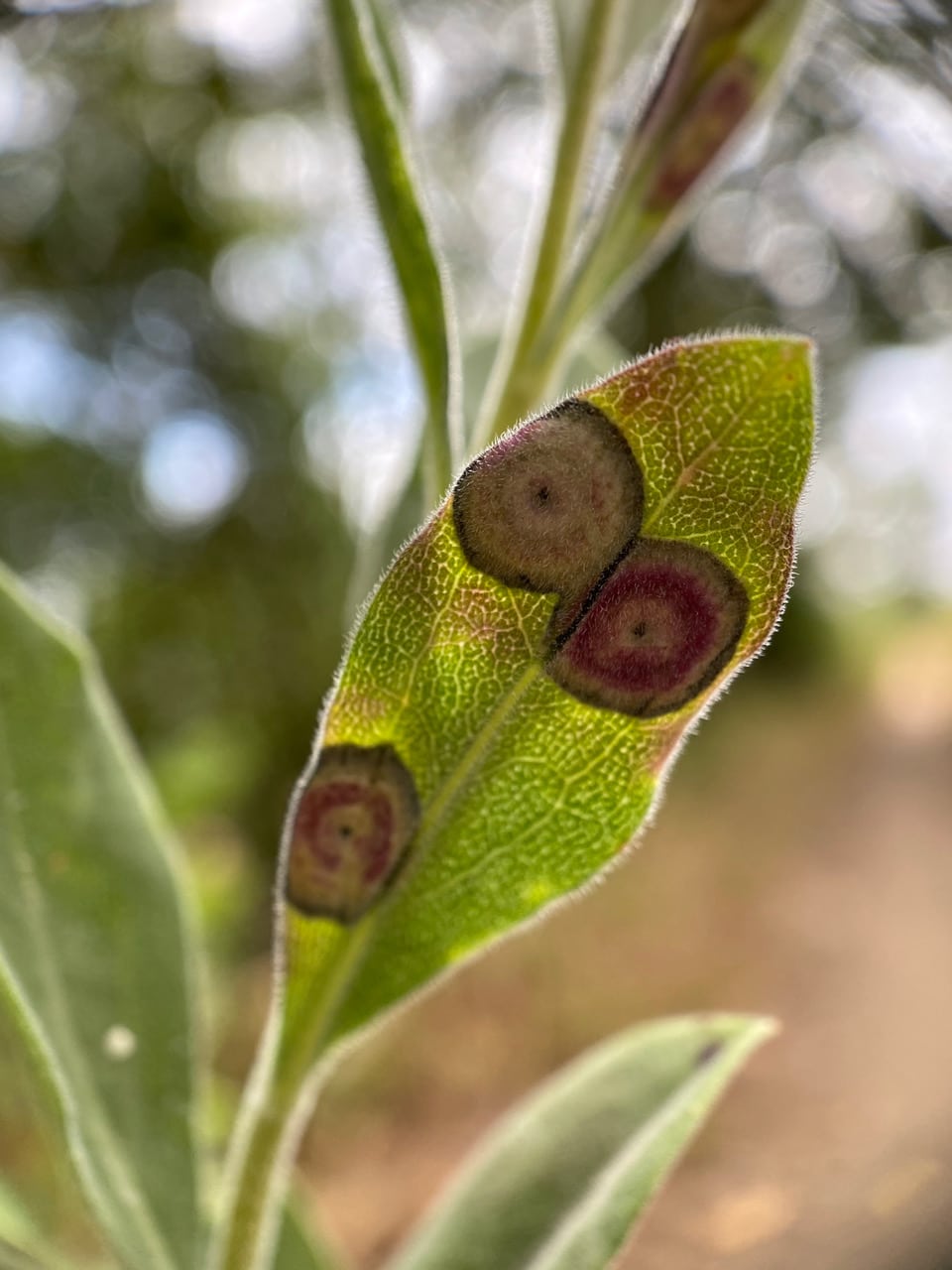 Backlit by the sun, the blister galls on the leaf of California Goldenrod, Solidago velutina ssp. californica appear even more colorful and bizarre.