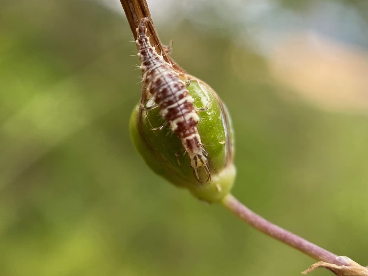 A Lacewing larva is resting on an immature fruit of Soap Plant, Chlorogalum pomeridianum that is infested with aphids.