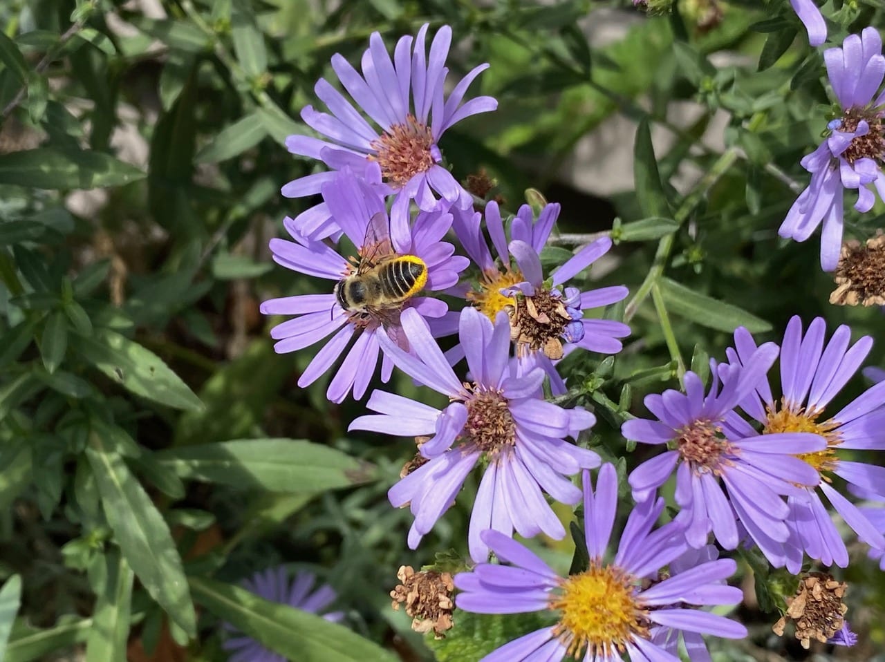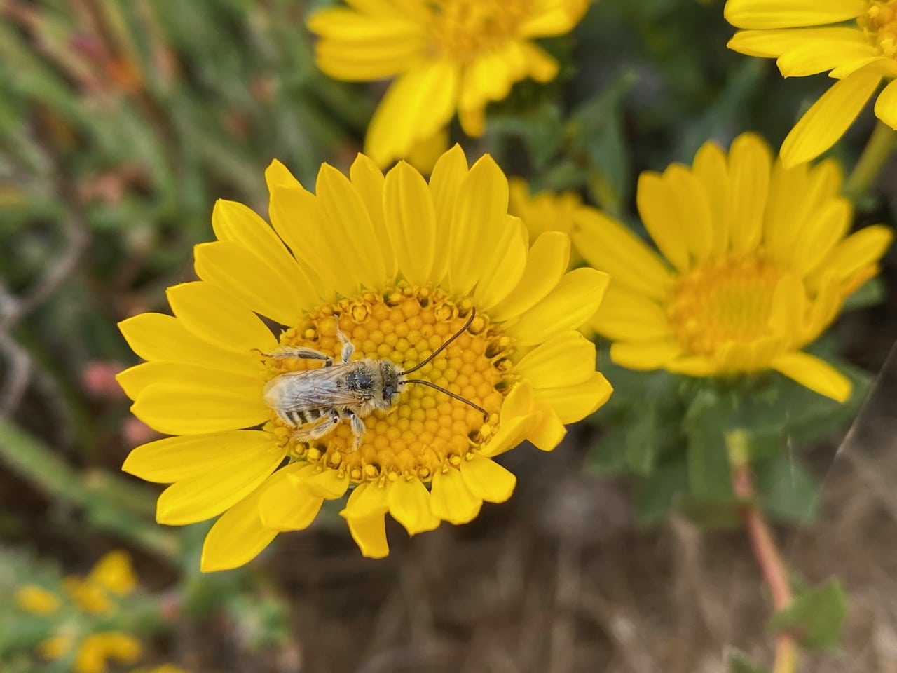 Many male Longhorn Bees, Melissodes sp. (family Apidae) are still asleep on the Grindelia flowerheads. These bees seem to be doing really well this year, seen in abundance everywhere in Alameda.