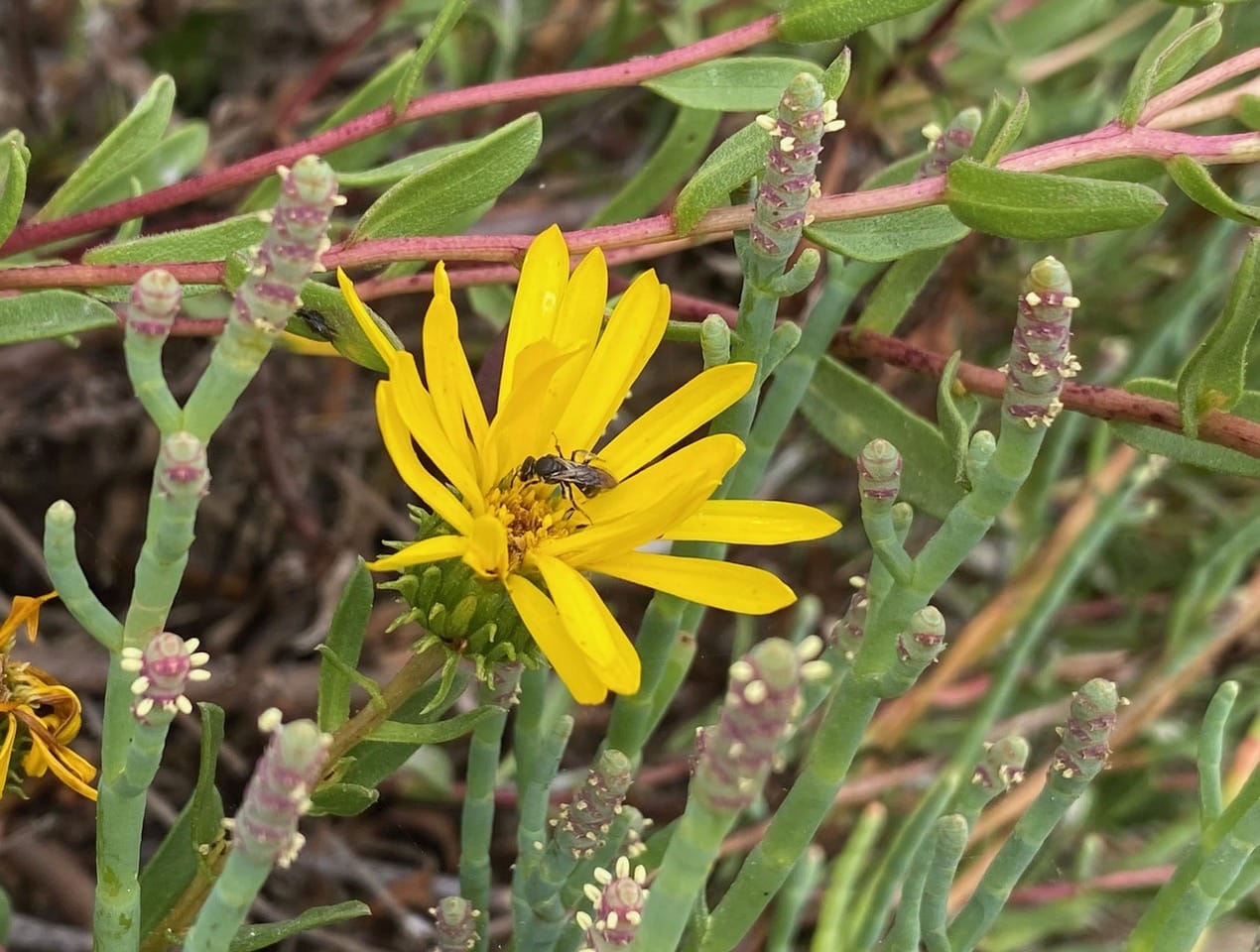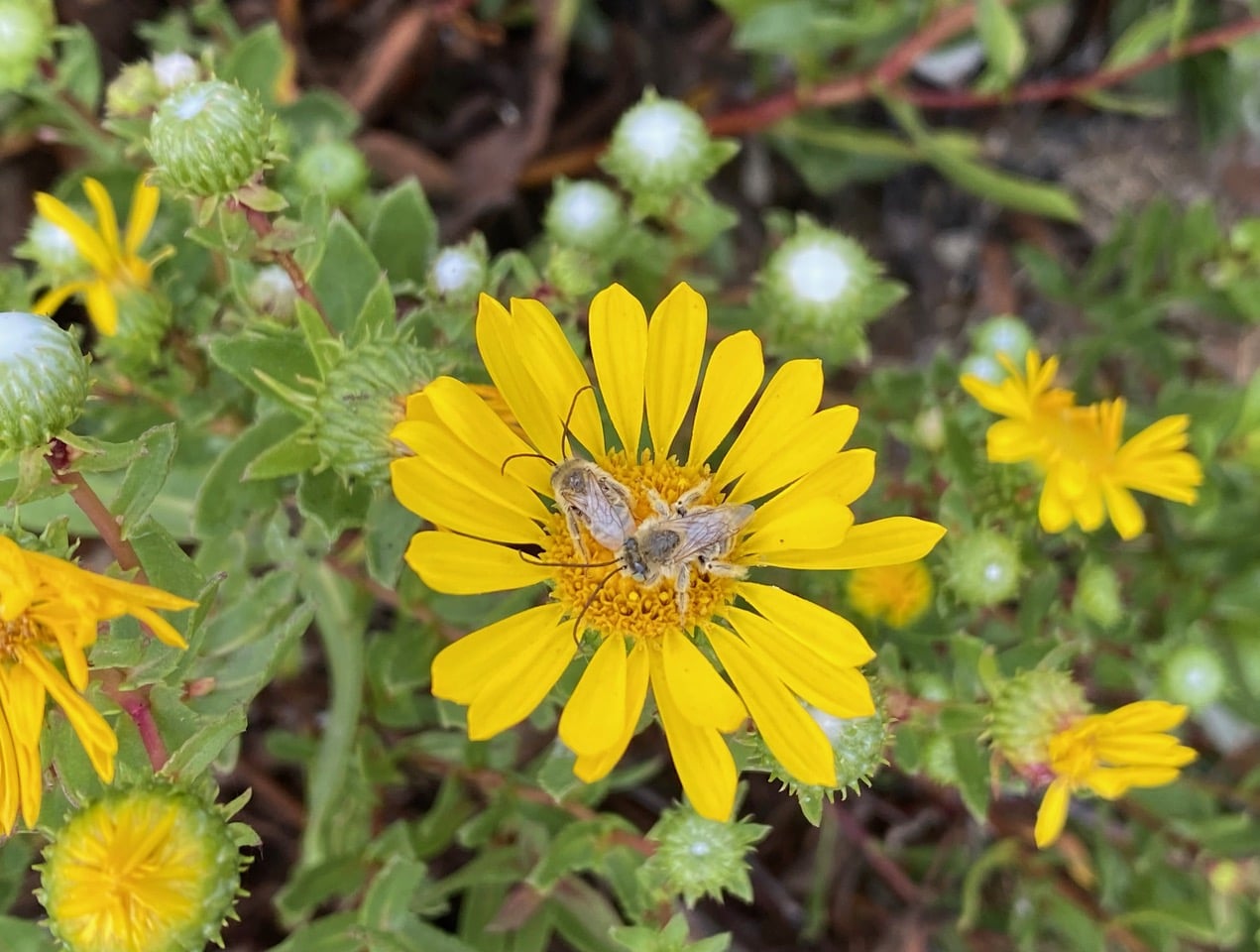 I next explore the Oregon Gumweed, Grindelia stricta blooming on the edges of the spit that encloses the marina on Ballena Bay.