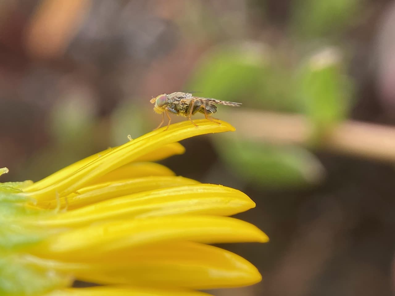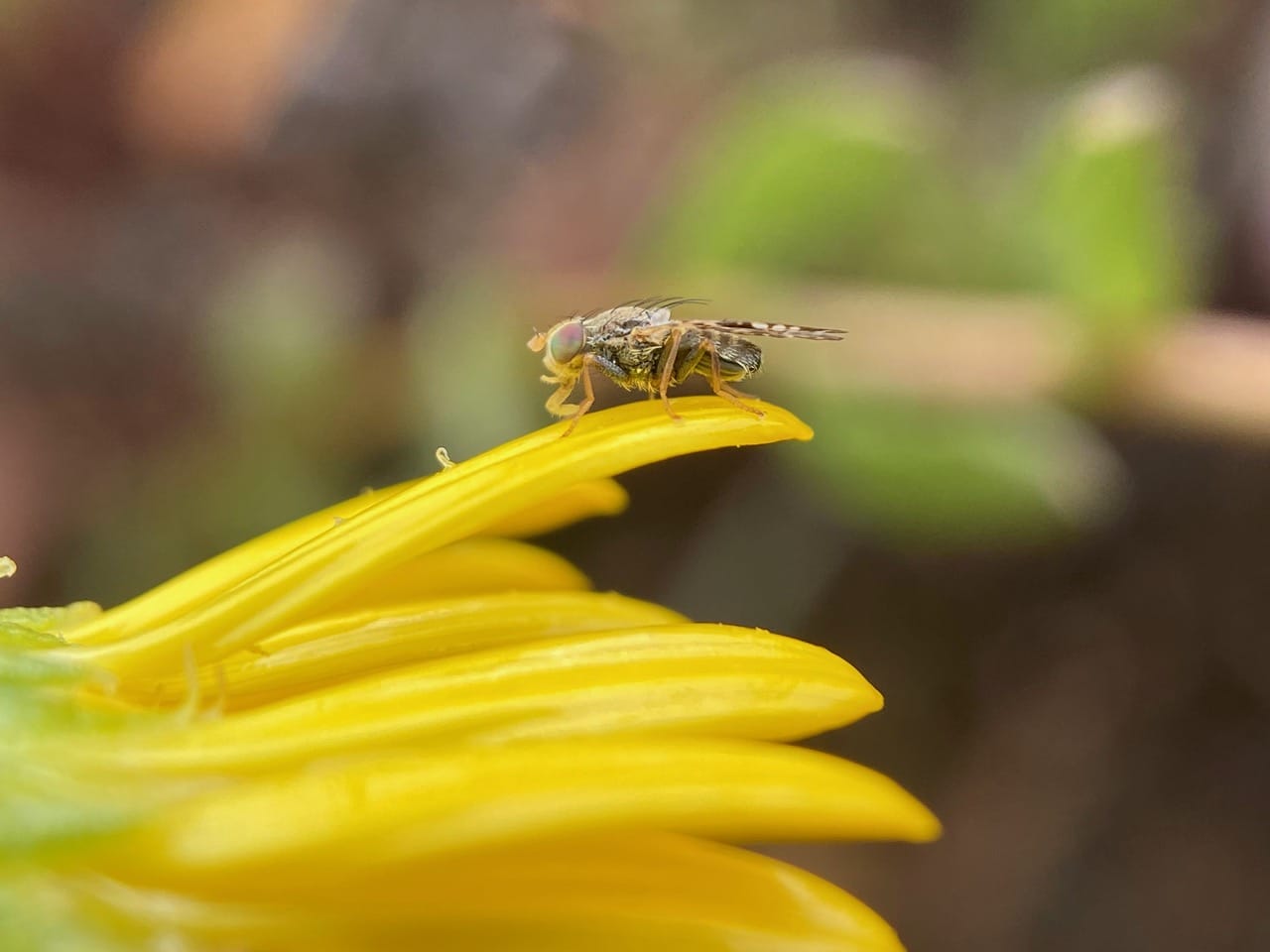 Wary of my approach, the Fruit Fly flees to a ray petal. It appears to be a male, lacking the oviscape at the end of its abdomen. Female Fruits Flies are easily distinguished by the presence of an oviscape – the pointy structure at the tip of their abdomen. The oviscape is the basal part of the ovipositor, the non-retractile sheath that protects the ovipositor. It remains exposed when the ovipositor is withdrawn and not in action.