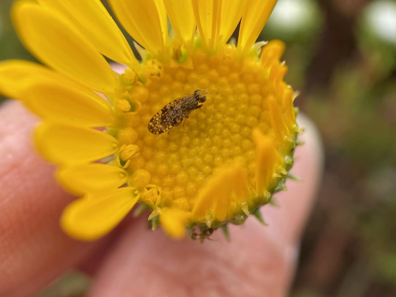 A Fruit Fly, Campiglossa sp. (family Tephritidae) is perched on a fresh Grindelia flowerhead.