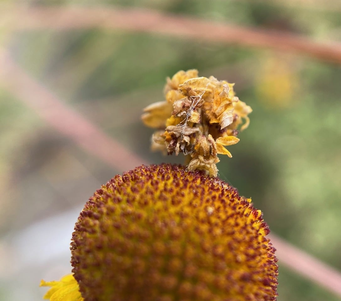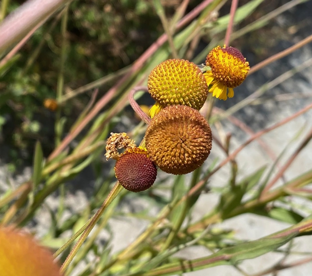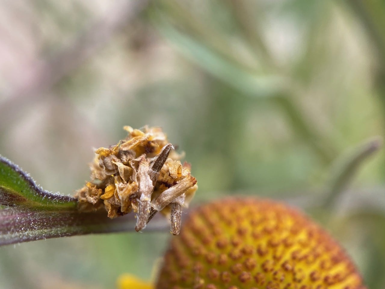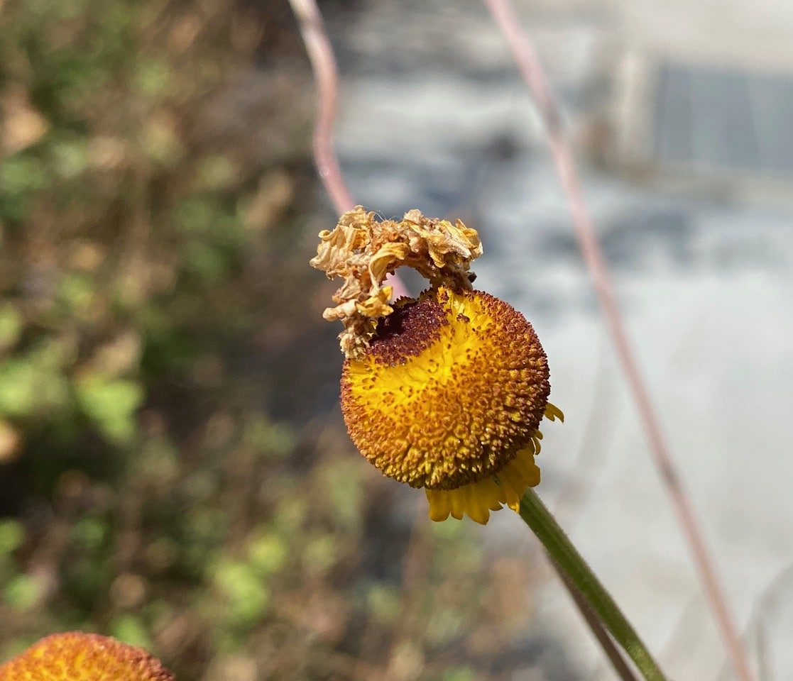 These Sneezeweed flowerheads have been entangled, probably by the wind. Do you see a Camouflage Looper on the lowest flowerhead? It’s a mere cake walk for this inchworm to travel from one flowerhead to the next, without having to climb up and down the flower stalks.