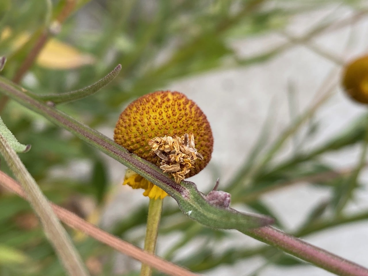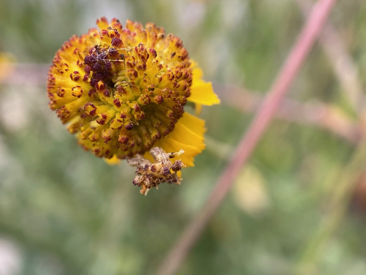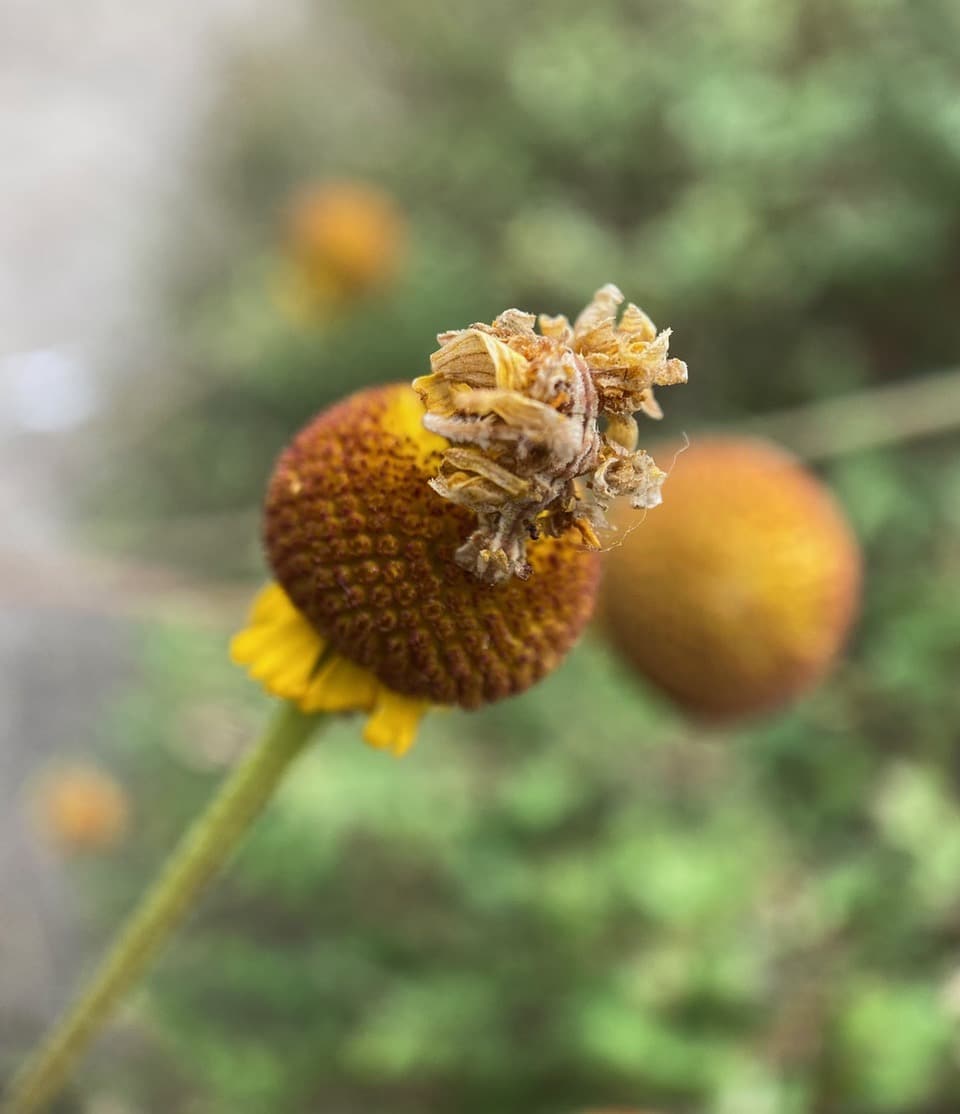 These Sneezeweed flowerheads have been entangled, probably by the wind. Do you see a Camouflage Looper on the lowest flowerhead? It’s a mere cake walk for this inchworm to travel from one flowerhead to the next, without having to climb up and down the flower stalks.