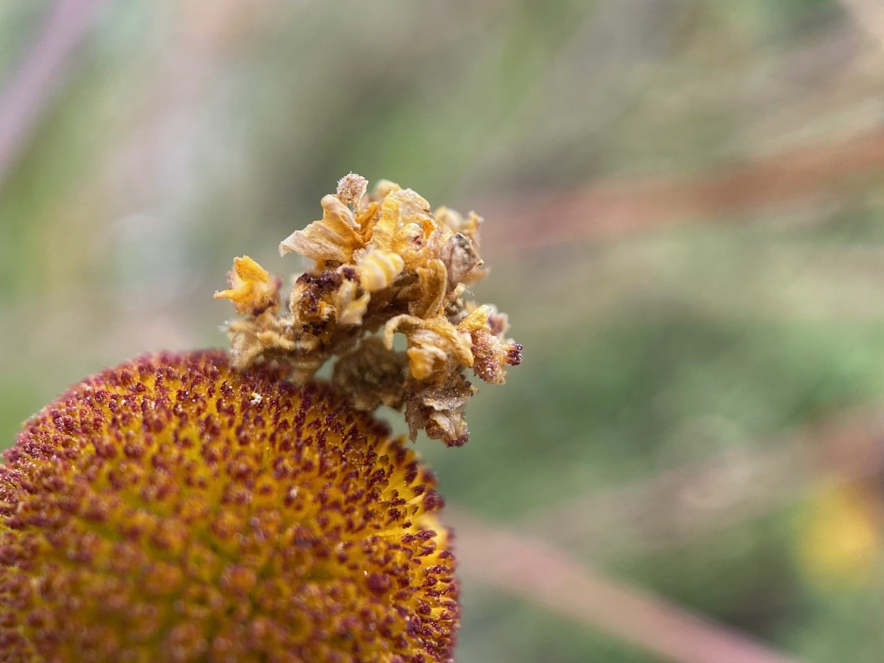 Ah, I think this is the hind end of the looper. It has its anal prolegs firmly planted on the flowerhead. Note the stray strands of silk from its work attaching the bits of flower parts to its body.