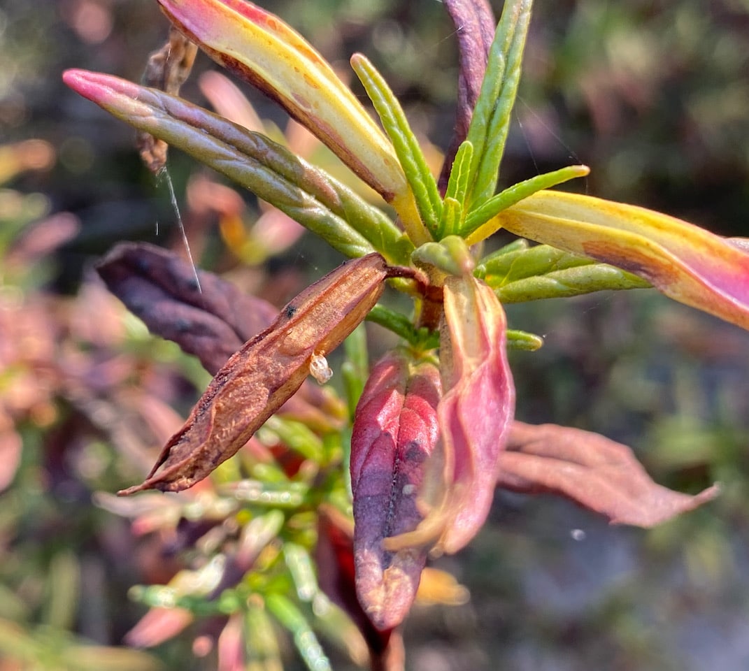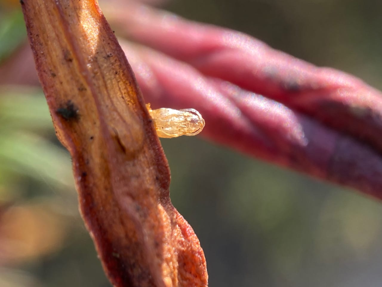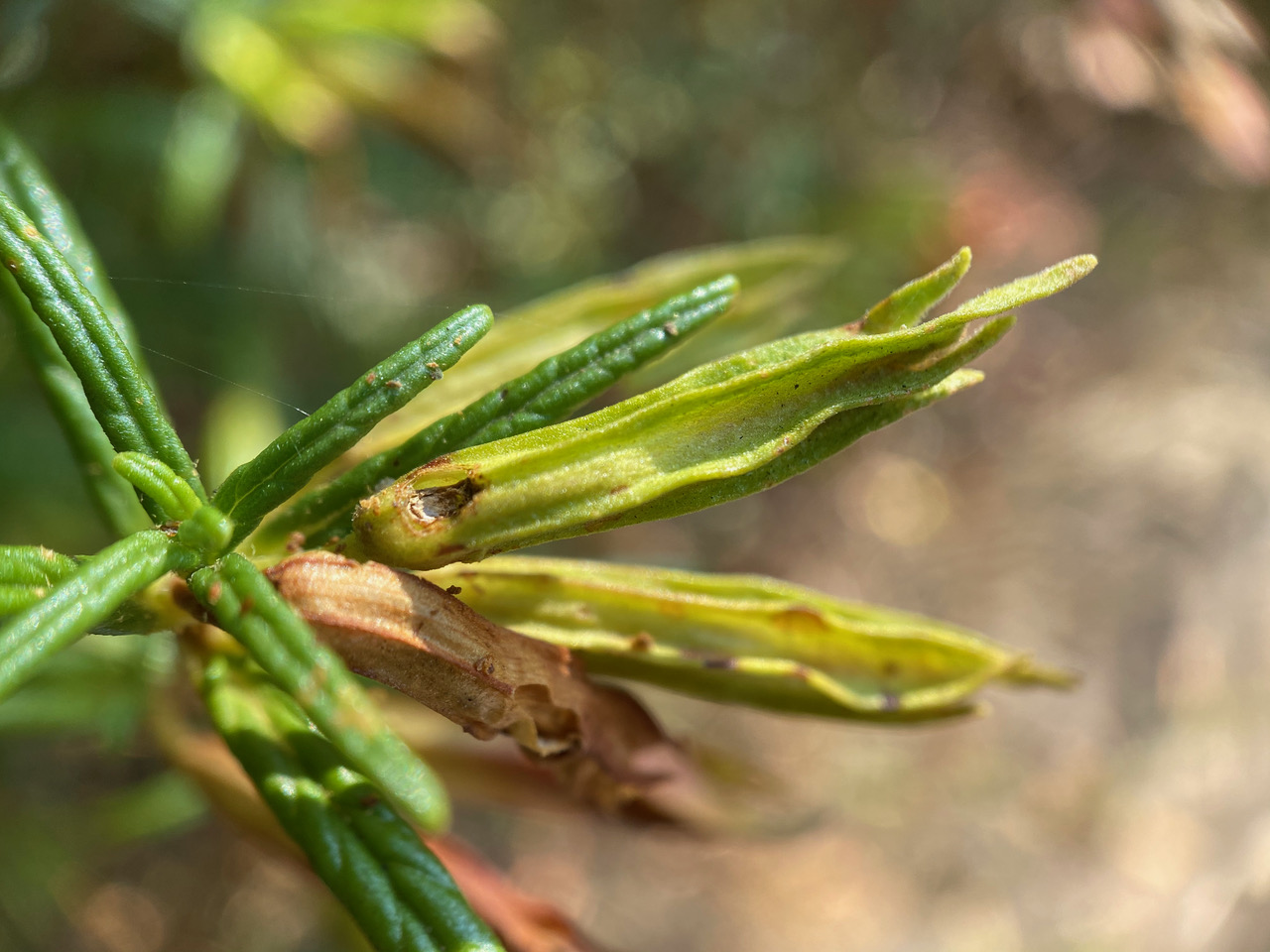 More evidence of predation on the developing seeds within the calyces of Sticky Monkeyflower, Diplacus aurantiacus. Note that the two predated calyces have never borne any flower. They were probably galled early before the flower buds had a chance to develop. The predators are probably after the gall insects, or the inquilines, or the parasitoid/hyperparasitoids within the calyces.