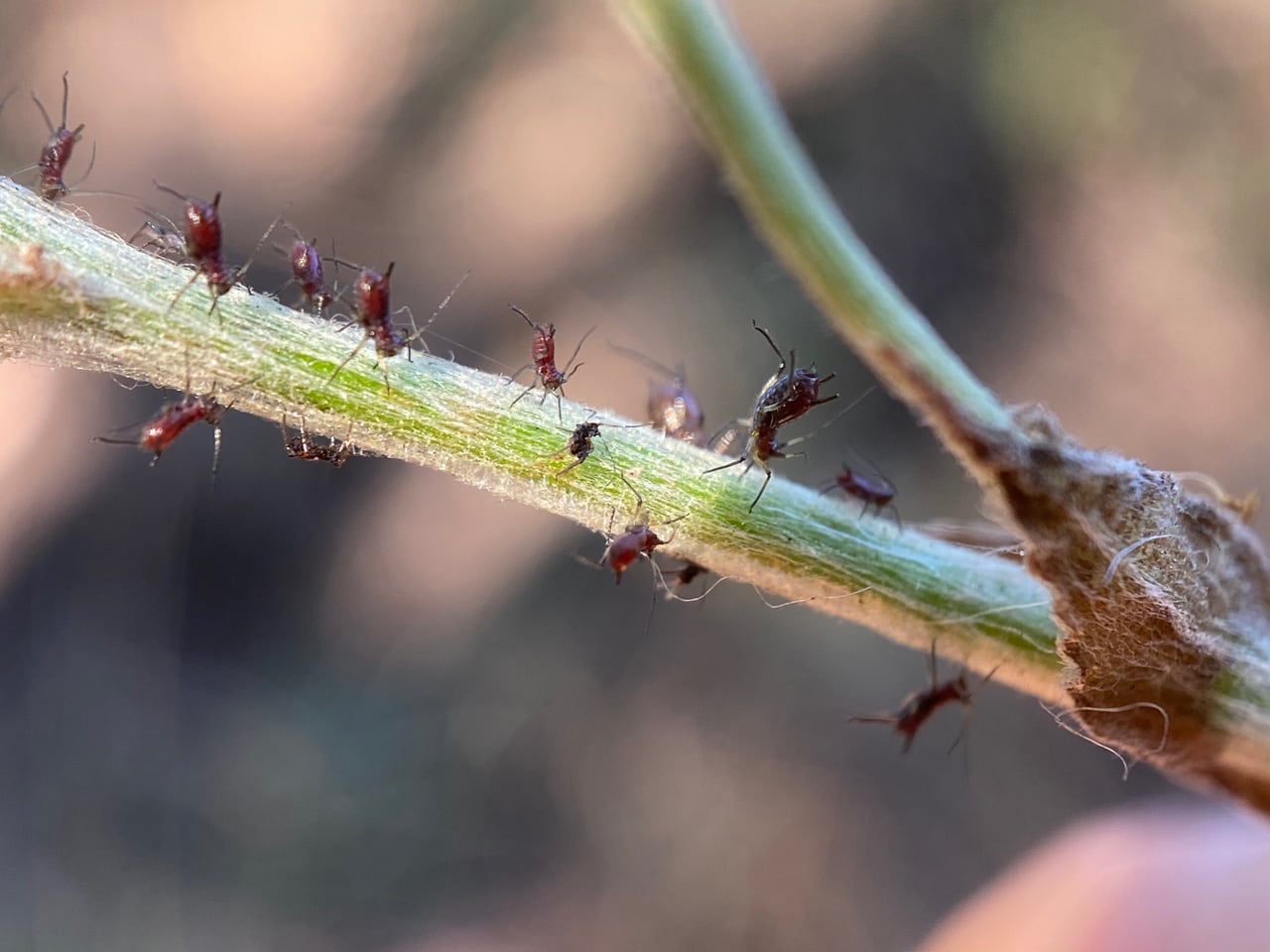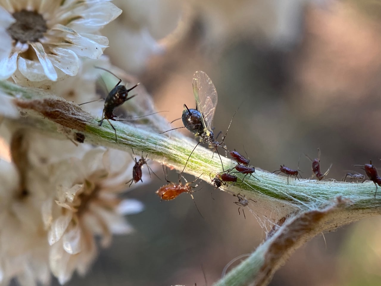 This morning I get a little better light on the small colony of aphids on the senescing California Everlasting. These are in the genus Uroleucon (family Aphididae). There’s already a mature alate, a winged reproductive that will disperse to establish a new colony elsewhere.