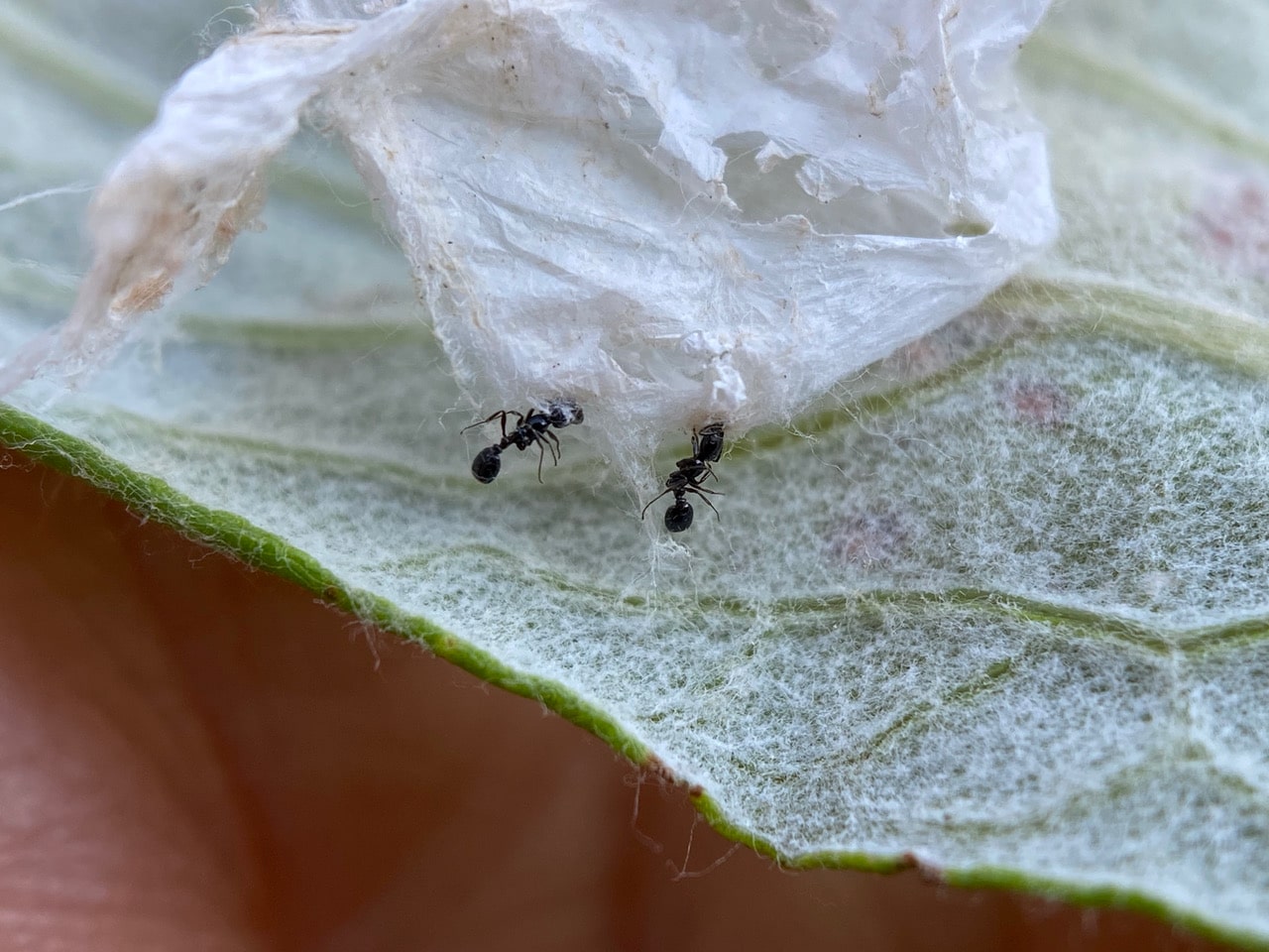 Two black ants have apparently managed to enter, but have died before getting into the silken sac inside. Does the silk contain anti-ant chemicals, or were the ants simply trapped on the silk?