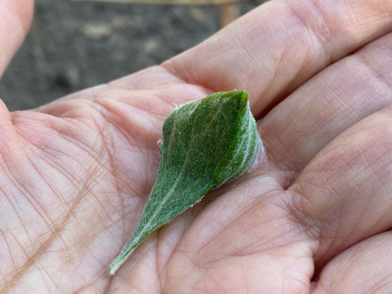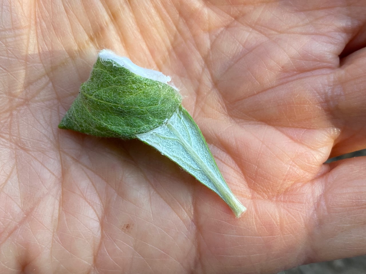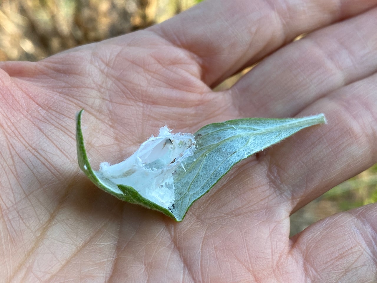 I remove the leaf from the plant, and manipulate it in my hand to get a sense of how the shelter was constructed.