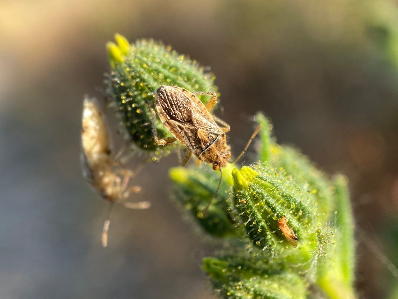 The Phacelia Plant Bugs, Tupiocoris californicus (family Miridae) are usually skittish, fast to run from the camera. This individual is hunched over feeding on something not visible to me on an immature flowerhead of Coast Tarweed. Minute as these bugs are, they are skilled at navigating the sticky terrain of the plant.