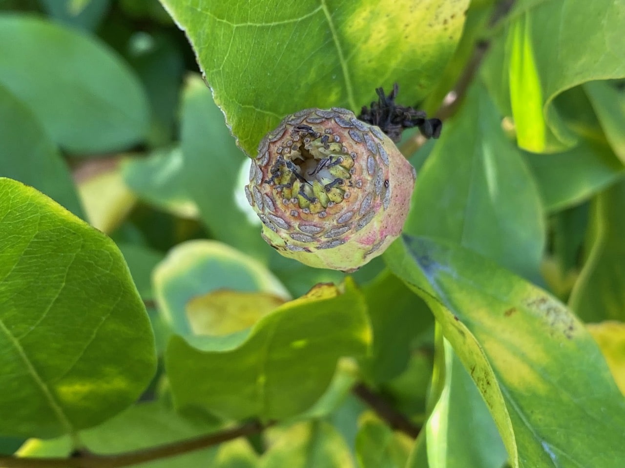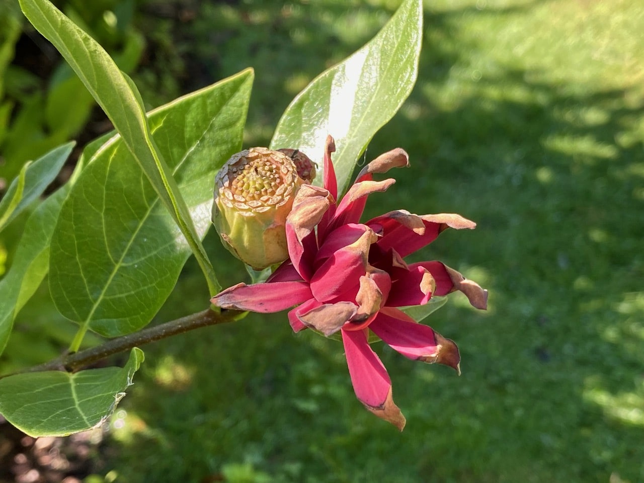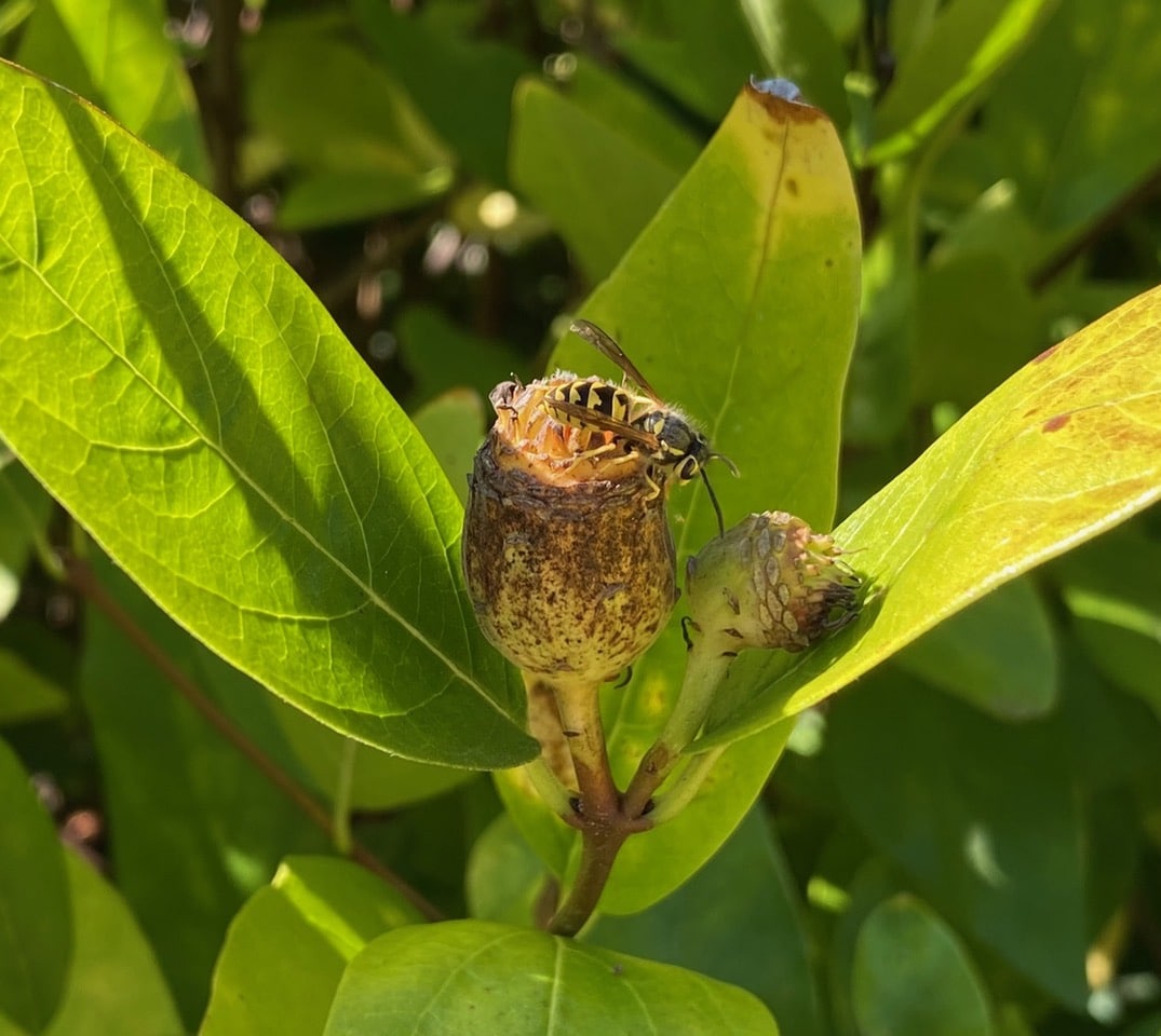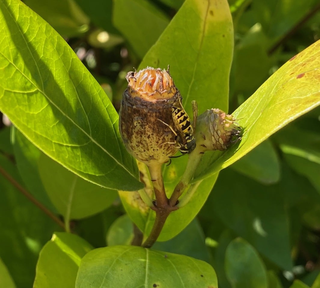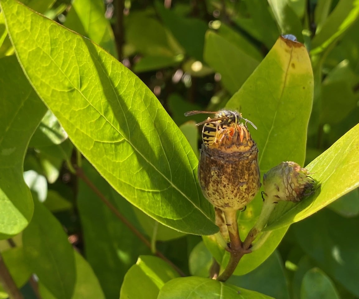 As I approach a Western Spice Bush, Calycanthus occidentalis, my eyes are drawn to a seed pod highlighted by the sunlight. A Yellowjacket is busy digging into the top of the browning pod.