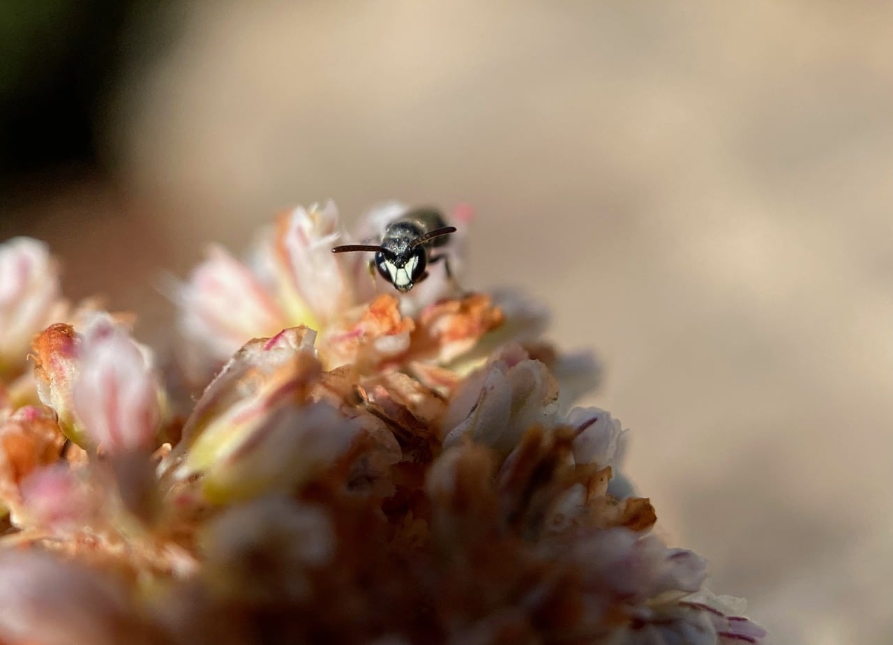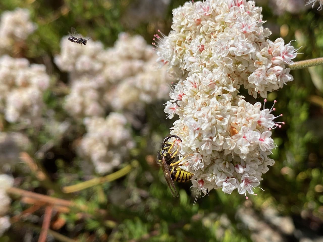 The blooming California Buckwheat, Eriogonum fasciculatum near the front gate is abuzz with insect activity. A tiny Masked Bee, Hylaeus sp. (Family Colletidae) is coming in for landing while a Yellowjacket wasp is taking nectar from an inflorescence.