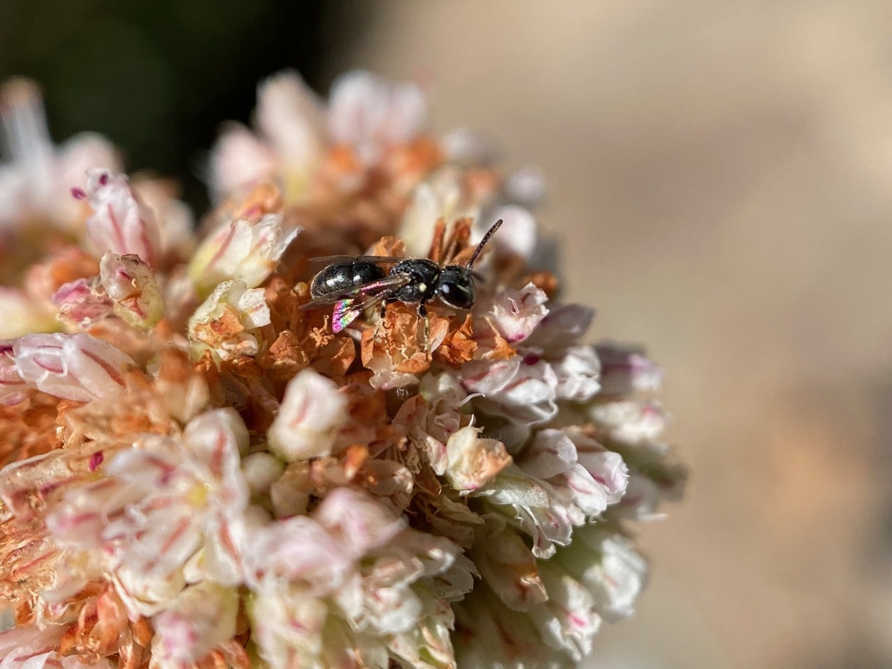 A Masked Bee, Hylaeus sp. (family Colletidae) has landed on a cluster of flowers of California Buckwheat.