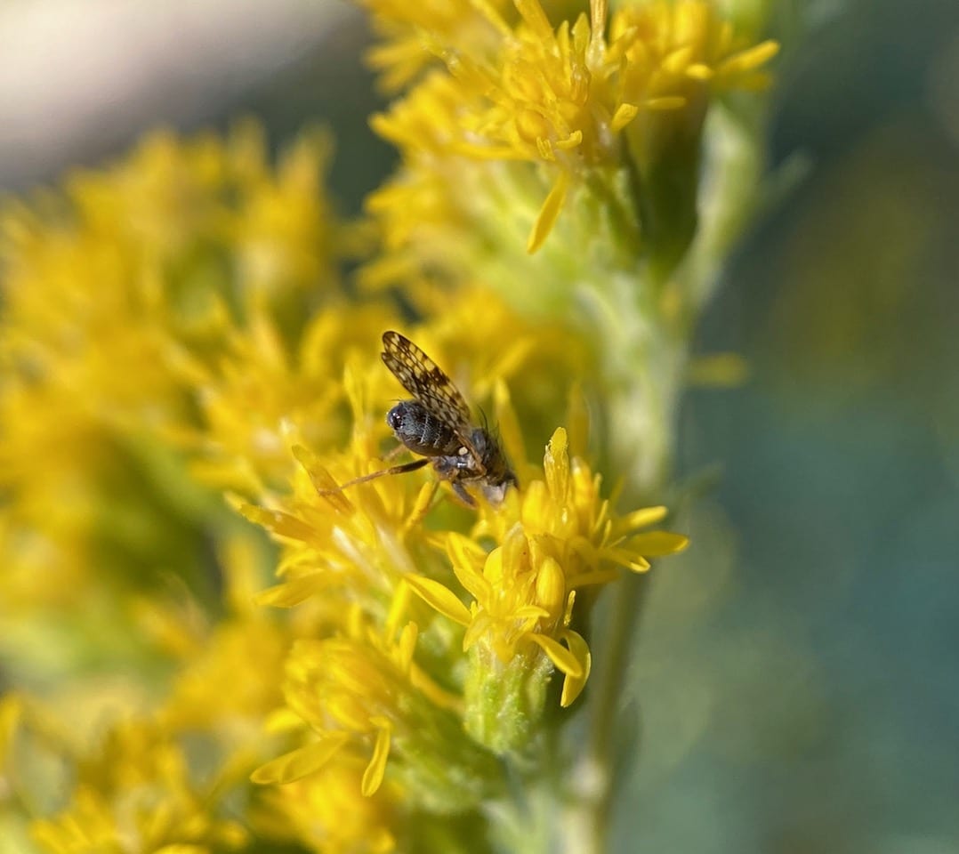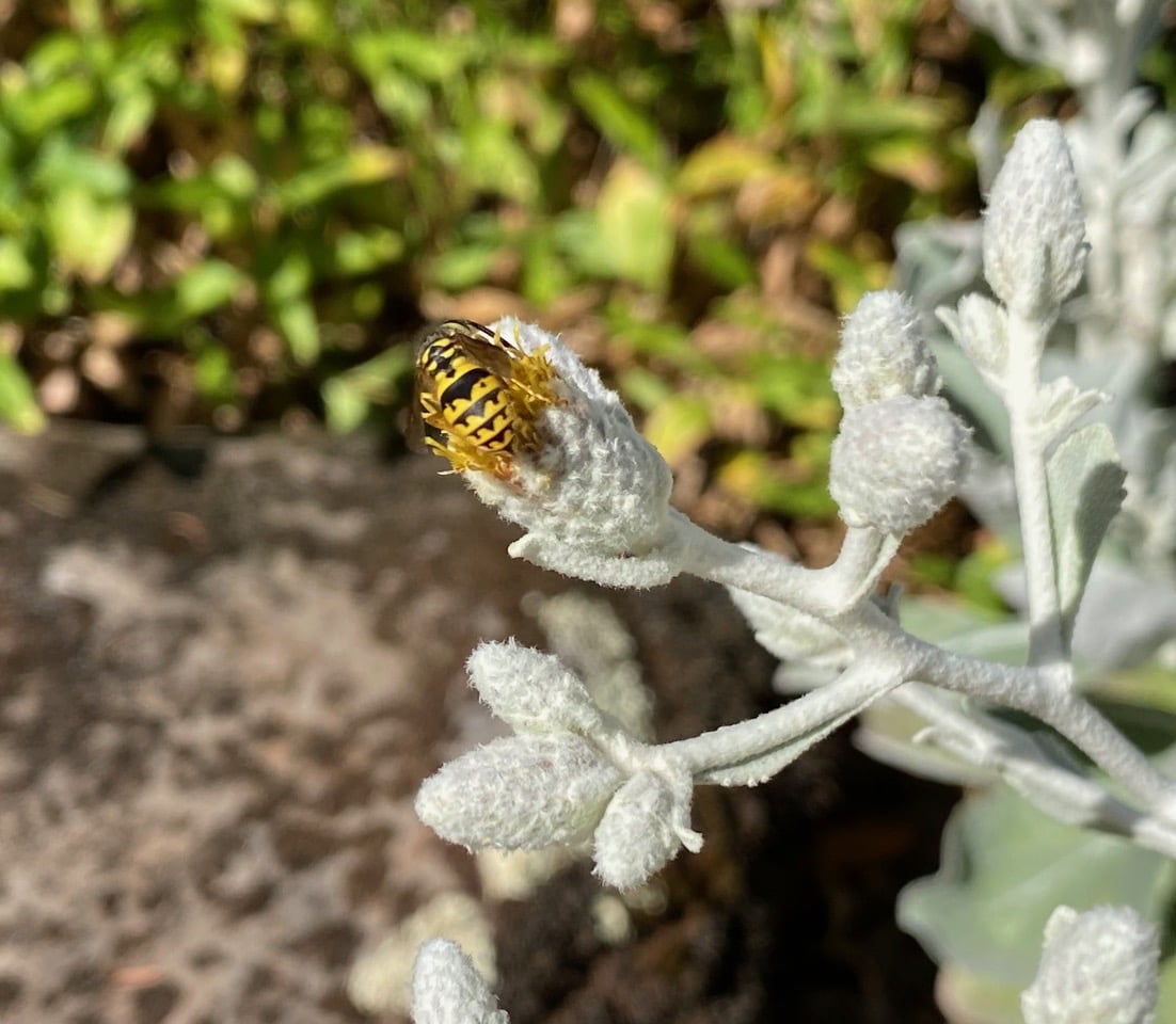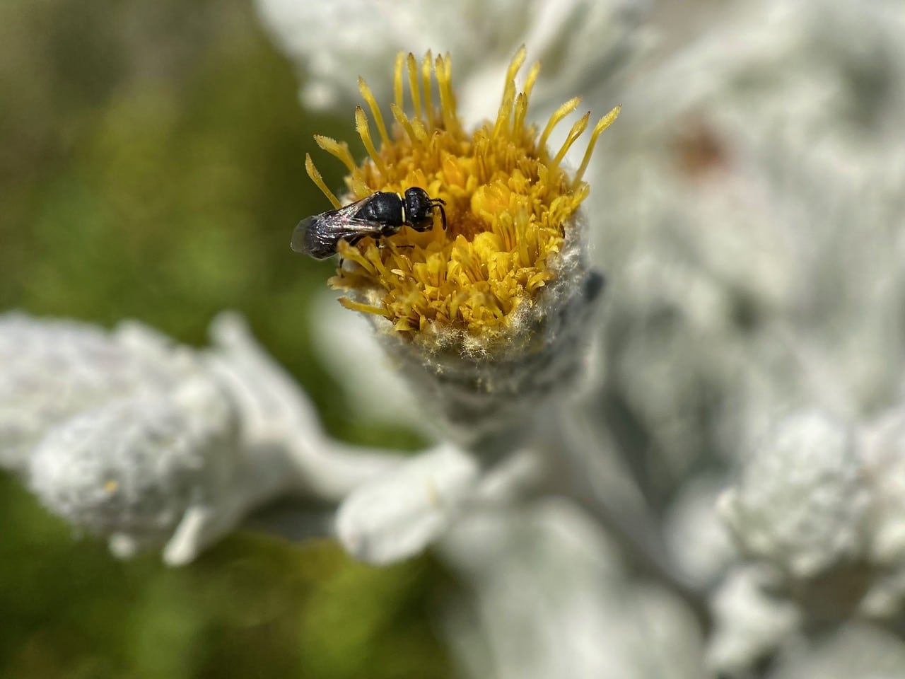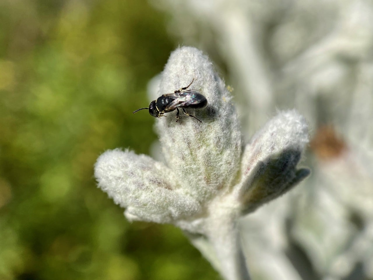 A Masked Bee, Hylaeus sp. (family Colletidae) is grooming itself on the fuzzy immature flowerhead of the overall hairy, felty plant.