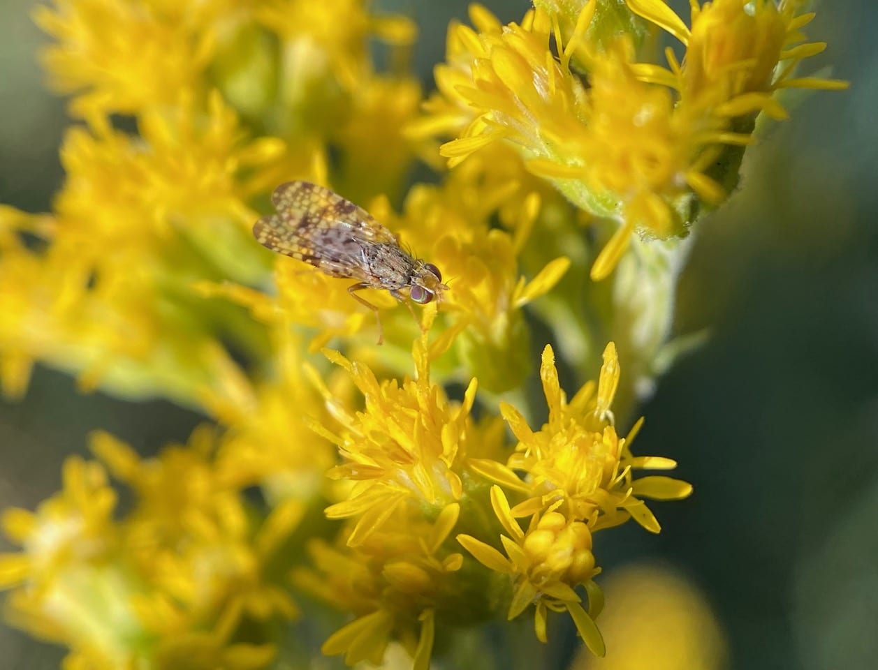 A Sunflower Seed Maggot Fly, Neotephritis finalis (family Tephritidae) is perched on the withered flowers of California Goldenrod.