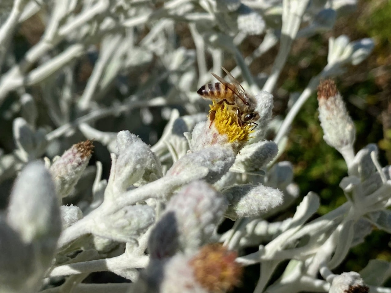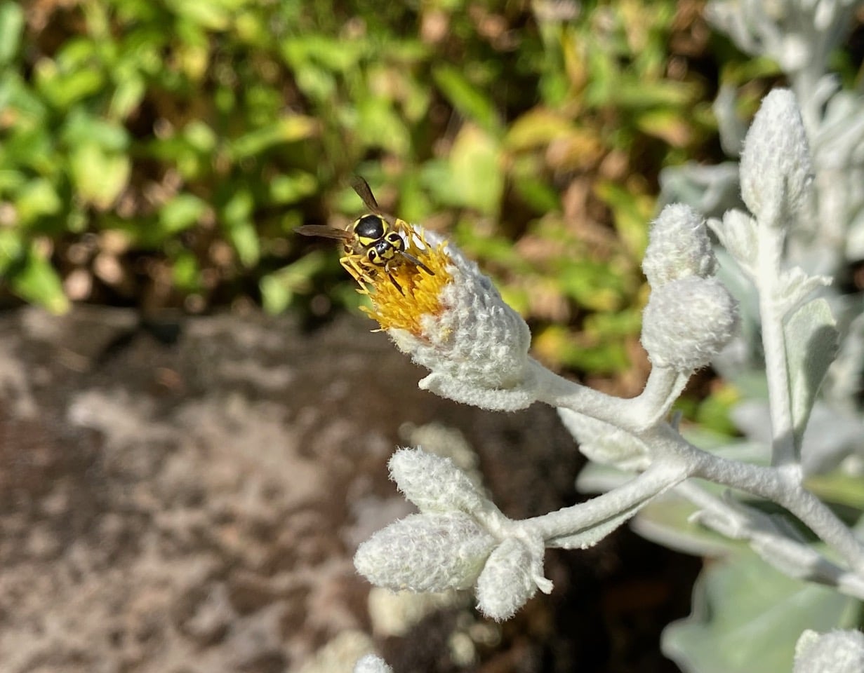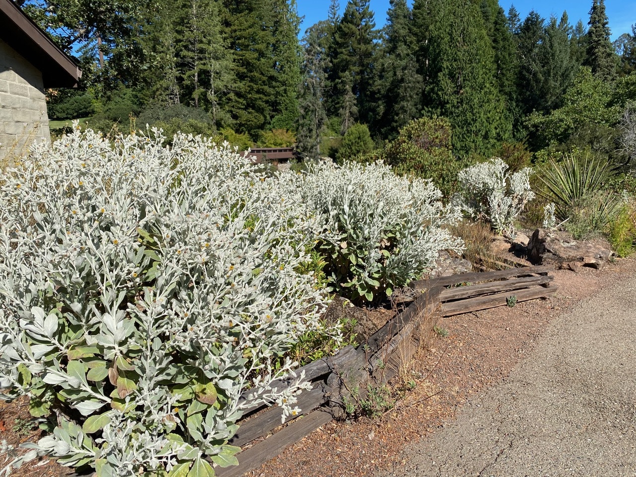 Although these silvery-gray plants by the visitor center do not appear to be in bloom, insects are swarming over them. On closer inspection, the plants are actually blooming profusely. They appear to be in the Sunflower family, Asteraceae, with small, compact flowerheads reminiscent of the Everlastings. Unfortunately there are no labels to identify the plants.