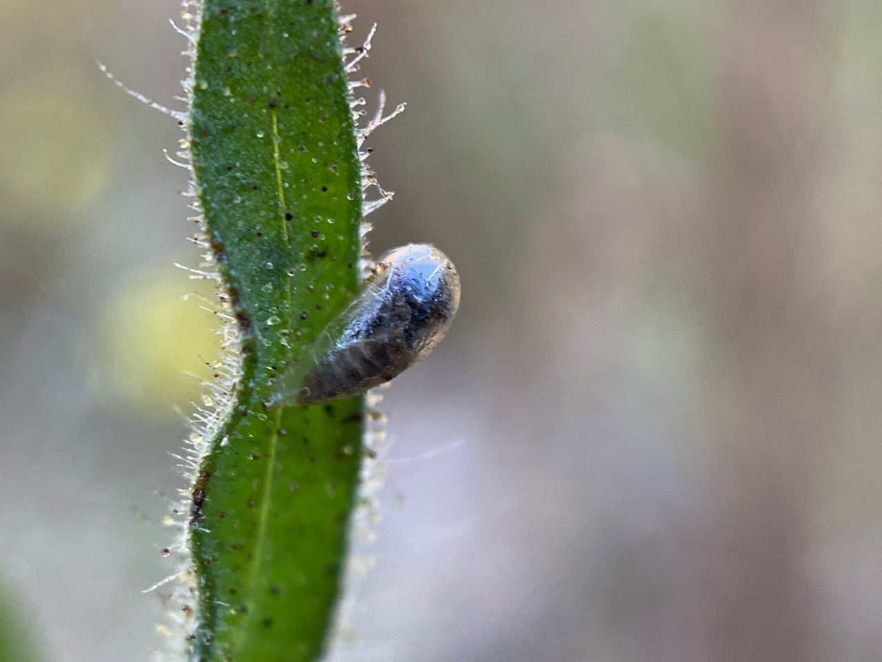 A fresh green Syrphid pupa is attached to a leaf axil of Coast Tarweed.