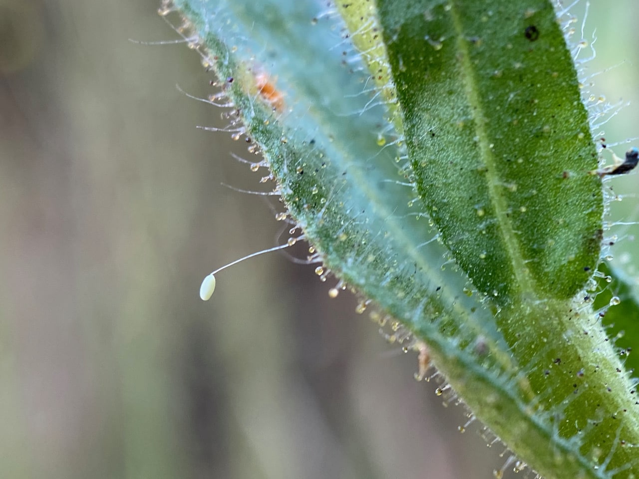 Hey, here’s a pretty fresh Lacewing egg, still greenish, one of three laid close to each other on adjacent leaves of Coast Tarweed. Smart of mama Lacewing to deposit her eggs here. Her larvae, sometimes called aphid lions, are voracious predators of aphids.