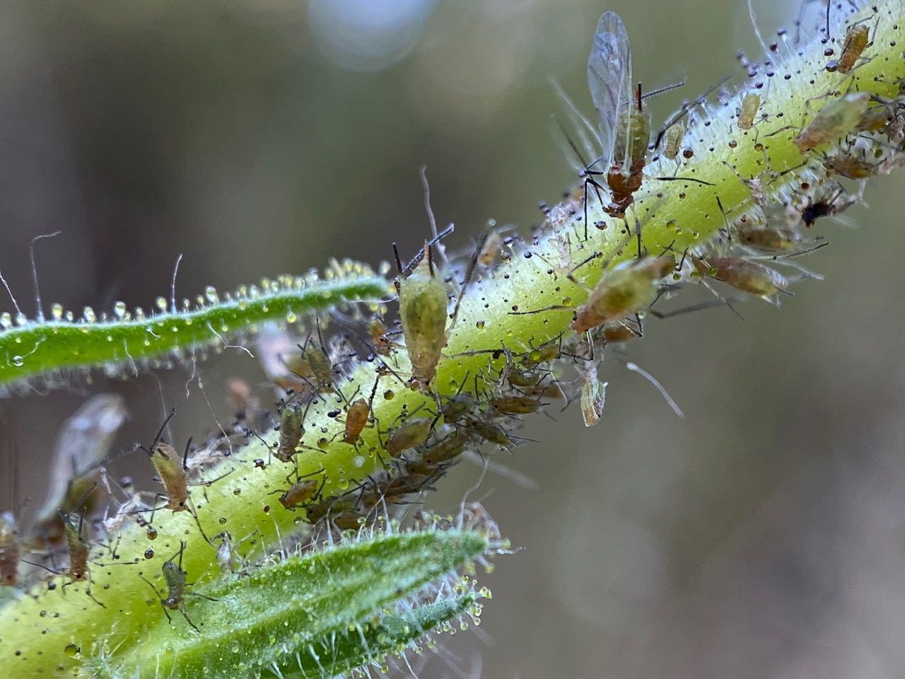 The aphids are multiplying in leaps and bounds. See those white things among the aphids? They are the shed exoskeletons left behind when the aphids molt.