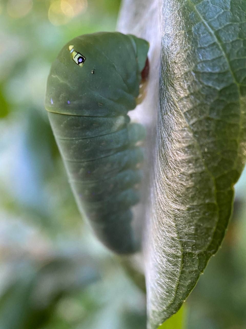 Like all insects, caterpillars have 6 legs – 3 pairs of jointed true legs, located on their thorax, right behind their head. The remaining structures under the abdomen are prolegs. Prolegs are small, fleshy, stubby structures which are attached to the abdomen; they aid in locomotion. The hindmost pair is called the anal prolegs. At the tip of each proleg is a small circle of gripping hooks, call “crochets”. The tiny barbs work like Velcro to tightly attach the prolegs to the substrate, such as leaves and twigs that the caterpillar is walking on. Prolegs do have limited musculature, but much of their movement is hydraulically powered.