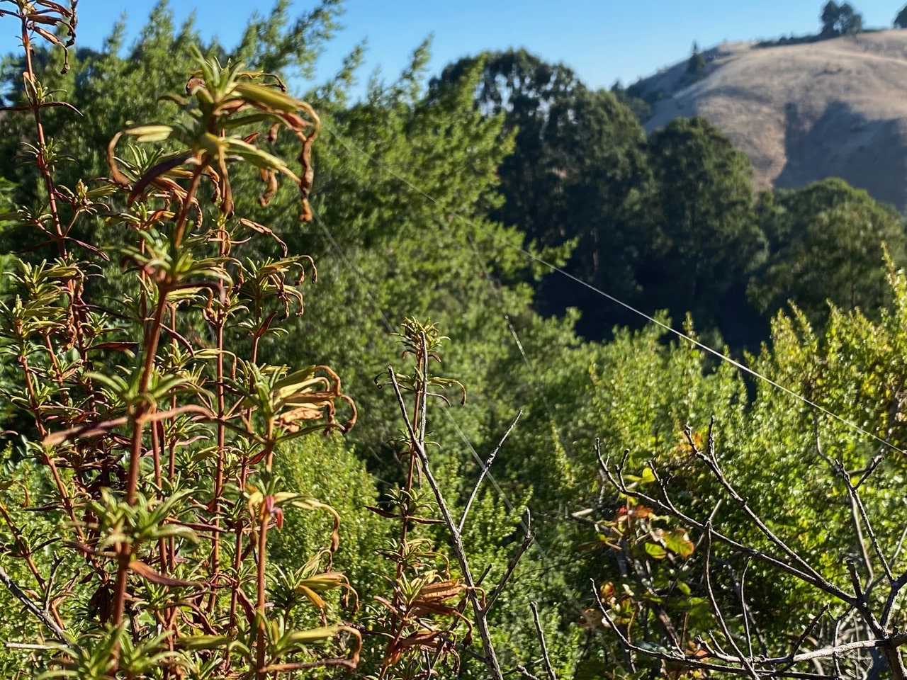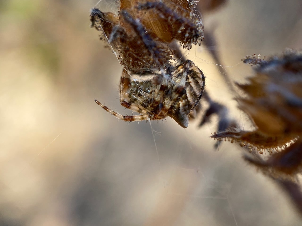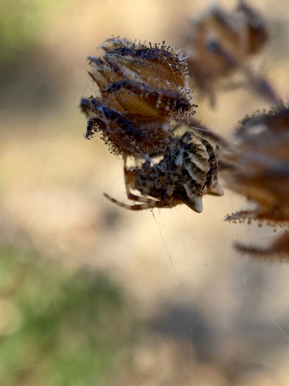 Less than 100 feet further along the trail, morning sunlight reveals an orb web strung between some dried Coast Tarweed stems. The owner is not on the web, but I easily find her below a spent seed head.